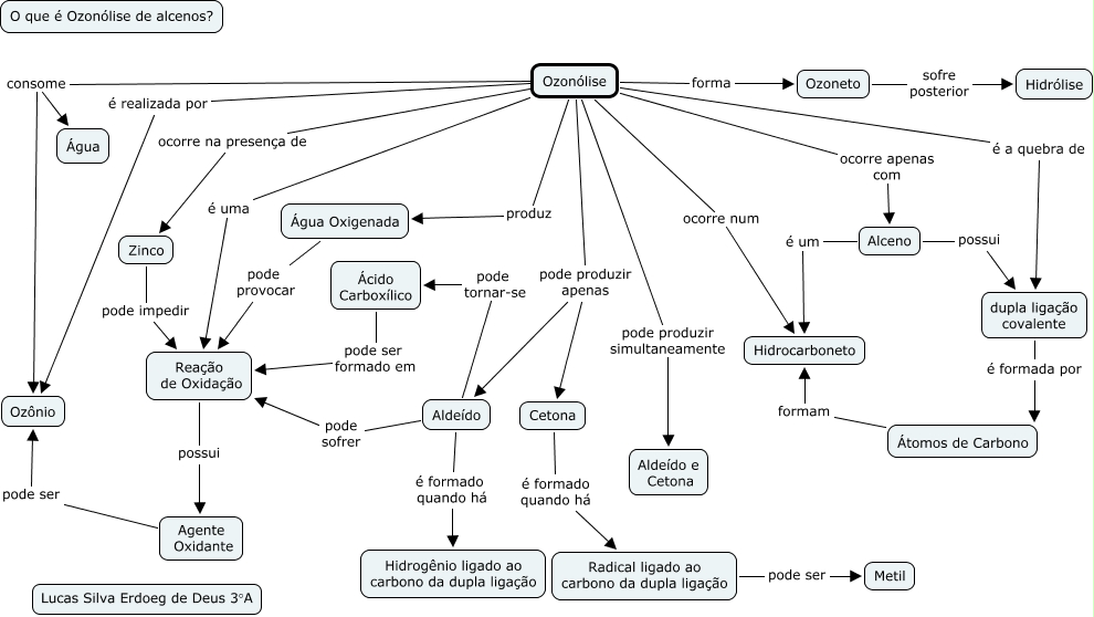 Esse mapa conceitual, produzido no IHMC CmapTools, tem a informação relacionada a: Ozonólise Lucas Silva, Cetona é formado quando há Radical ligado ao carbono da dupla ligação, Ozonólise ocorre apenas com Alceno, Aldeído é formado quando há Hidrogênio ligado ao carbono da dupla ligação, Ozonólise ocorre na presença de Zinco, Aldeído pode sofrer Reação de Oxidação, Ozonólise é uma Reação de Oxidação, Ozonólise consome Ozônio, Reação de Oxidação possui Agente Oxidante, Agente Oxidante pode ser Ozônio, Ozonólise ocorre num Hidrocarboneto, Aldeído pode tornar-se Ácido Carboxílico, Ozonólise forma Ozoneto, Radical ligado ao carbono da dupla ligação pode ser Metil, Alceno é um Hidrocarboneto, Ozonólise pode produzir simultaneamente Aldeído e Cetona, Ácido Carboxílico pode ser formado em Reação de Oxidação, dupla ligação covalente é formada por Átomos de Carbono, Ozonólise produz Água Oxigenada, Ozonólise pode produzir apenas Cetona, Ozoneto sofre posterior Hidrólise