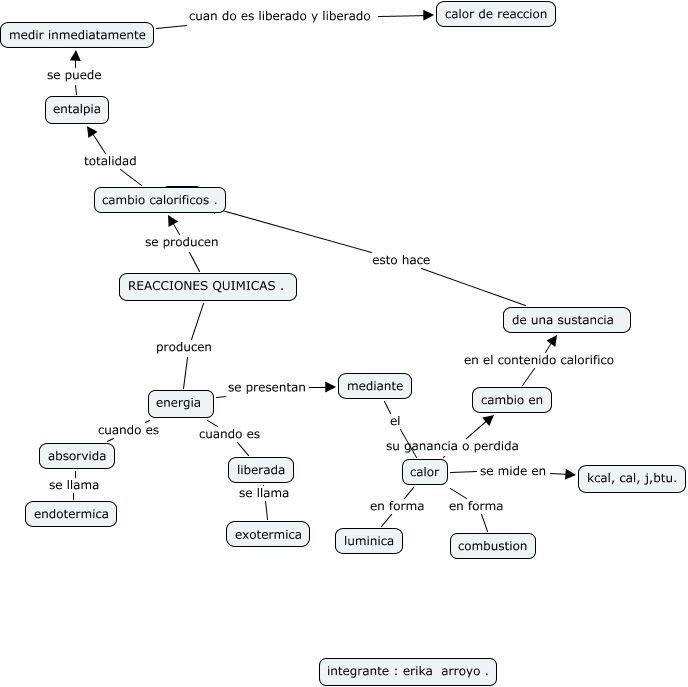 Este Cmap, tiene información relacionada con: reacciones quimicas de 10b erika durley, cambio en en el contenido calorifico de una sustancia, REACCIONES QUIMICAS . se producen cambio calorificos ., REACCIONES QUIMICAS . producen energia, medir inmediatamente cuan do es liberado y liberado calor de reaccion, cambio calorificos . totalidad entalpia, liberada se llama exotermica, absorvida se llama endotermica, energia se presentan mediante, energia cuando es liberada, de una sustancia esto hace ????, calor en forma luminica, mediante el calor, energia cuando es absorvida, calor se mide en kcal, cal, j,btu., calor en forma combustion, calor su ganancia o perdida cambio en, entalpia se puede medir inmediatamente