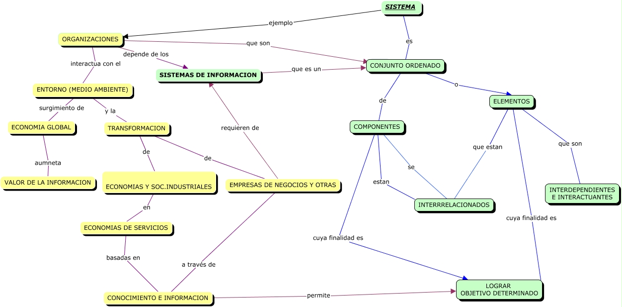 Este Cmap, tiene información relacionada con: Sistema, Sistema de Información, ECONOMIA GLOBAL aumneta VALOR DE LA INFORMACION, COMPONENTES se INTERRRELACIONADOS, EMPRESAS DE NEGOCIOS Y OTRAS requieren de SISTEMAS DE INFORMACION, ECONOMIAS DE SERVICIOS basadas en CONOCIMIENTO E INFORMACION, EMPRESAS DE NEGOCIOS Y OTRAS a través de CONOCIMIENTO E INFORMACION, SISTEMAS DE INFORMACION que es un CONJUNTO ORDENADO, CONOCIMIENTO E INFORMACION permite LOGRAR OBJETIVO DETERMINADO, TRANSFORMACION de ECONOMIAS Y SOC.INDUSTRIALES, ELEMENTOS que estan INTERRRELACIONADOS, ECONOMIAS Y SOC.INDUSTRIALES en ECONOMIAS DE SERVICIOS, CONJUNTO ORDENADO o ELEMENTOS, ENTORNO (MEDIO AMBIENTE) surgimiento de ECONOMIA GLOBAL, ELEMENTOS cuya finalidad es LOGRAR OBJETIVO DETERMINADO, ORGANIZACIONES depende de los SISTEMAS DE INFORMACION, SISTEMA ejemplo ORGANIZACIONES, ENTORNO (MEDIO AMBIENTE) y la TRANSFORMACION, SISTEMA es CONJUNTO ORDENADO, ORGANIZACIONES que son ????, ORGANIZACIONES interactua con el ENTORNO (MEDIO AMBIENTE), ELEMENTOS que son INTERDEPENDIENTES E INTERACTUANTES