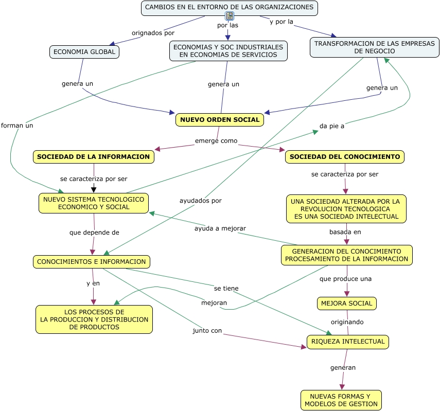 Este Cmap, tiene información relacionada con: SOCIEDAD_DE_LA_INFORMACION_Y_DEL_CONOCIMIENTO.cmap, CONOCIMIENTOS E INFORMACION se tiene RIQUEZA INTELECTUAL, GENERACION DEL CONOCIMIENTO PROCESAMIENTO DE LA INFORMACION mejoran LOS PROCESOS DE LA PRODUCCION Y DISTRIBUCION DE PRODUCTOS, SOCIEDAD DE LA INFORMACION se caracteriza por ser NUEVO SISTEMA TECNOLOGICO ECONOMICO Y SOCIAL, ECONOMIAS Y SOC INDUSTRIALES EN ECONOMIAS DE SERVICIOS genera un NUEVO ORDEN SOCIAL, ECONOMIA GLOBAL genera un NUEVO ORDEN SOCIAL, TRANSFORMACION DE LAS EMPRESAS DE NEGOCIO ayudados por CONOCIMIENTOS E INFORMACION, CAMBIOS EN EL ENTORNO DE LAS ORGANIZACIONES orignados por ECONOMIA GLOBAL, UNA SOCIEDAD ALTERADA POR LA REVOLUCION TECNOLOGICA ES UNA SOCIEDAD INTELECTUAL basada en GENERACION DEL CONOCIMIENTO PROCESAMIENTO DE LA INFORMACION, NUEVO ORDEN SOCIAL emerge como SOCIEDAD DEL CONOCIMIENTO, MEJORA SOCIAL originando RIQUEZA INTELECTUAL, CAMBIOS EN EL ENTORNO DE LAS ORGANIZACIONES por las ECONOMIAS Y SOC INDUSTRIALES EN ECONOMIAS DE SERVICIOS, ECONOMIAS Y SOC INDUSTRIALES EN ECONOMIAS DE SERVICIOS forman un NUEVO SISTEMA TECNOLOGICO ECONOMICO Y SOCIAL, GENERACION DEL CONOCIMIENTO PROCESAMIENTO DE LA INFORMACION ayuda a mejorar NUEVO SISTEMA TECNOLOGICO ECONOMICO Y SOCIAL, NUEVO ORDEN SOCIAL emerge como SOCIEDAD DE LA INFORMACION, TRANSFORMACION DE LAS EMPRESAS DE NEGOCIO genera un NUEVO ORDEN SOCIAL, CAMBIOS EN EL ENTORNO DE LAS ORGANIZACIONES y por la TRANSFORMACION DE LAS EMPRESAS DE NEGOCIO, CONOCIMIENTOS E INFORMACION junto con RIQUEZA INTELECTUAL, SOCIEDAD DEL CONOCIMIENTO se caracteriza por ser UNA SOCIEDAD ALTERADA POR LA REVOLUCION TECNOLOGICA ES UNA SOCIEDAD INTELECTUAL, NUEVO SISTEMA TECNOLOGICO ECONOMICO Y SOCIAL que depende de CONOCIMIENTOS E INFORMACION, CONOCIMIENTOS E INFORMACION y en LOS PROCESOS DE LA PRODUCCION Y DISTRIBUCION DE PRODUCTOS