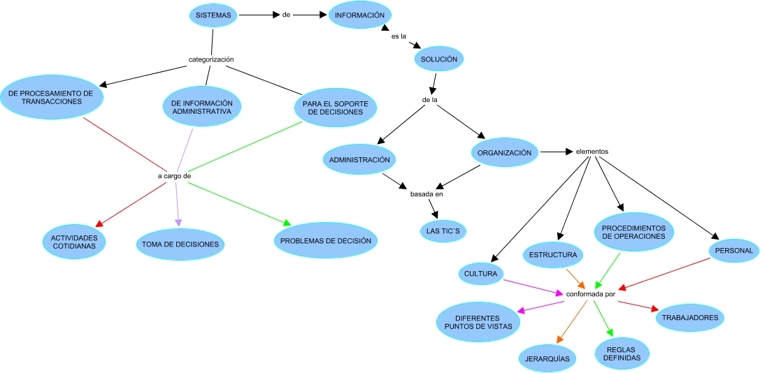 Este Cmap, tiene información relacionada con: CATEGORIZACIÓN DE LOS SISTEMAS ORGANIZACIONALES, ADMINISTRACIÓN basada en LAS TIC´S, PERSONAL conformada por REGLAS DEFINIDAS, ESTRUCTURA conformada por REGLAS DEFINIDAS, SOLUCIÓN de la ORGANIZACIÓN, ORGANIZACIÓN elementos PERSONAL, CULTURA conformada por TRABAJADORES, INFORMACIÓN es la SOLUCIÓN, PROCEDIMIENTOS DE OPERACIONES conformada por TRABAJADORES, PARA EL SOPORTE DE DECISIONES a cargo de PROBLEMAS DE DECISIÓN, DE PROCESAMIENTO DE TRANSACCIONES a cargo de ACTIVIDADES COTIDIANAS, CULTURA conformada por REGLAS DEFINIDAS, ORGANIZACIÓN elementos CULTURA, PARA EL SOPORTE DE DECISIONES a cargo de TOMA DE DECISIONES, SISTEMAS categorización PARA EL SOPORTE DE DECISIONES, SISTEMAS categorización DE PROCESAMIENTO DE TRANSACCIONES, PROCEDIMIENTOS DE OPERACIONES conformada por DIFERENTES PUNTOS DE VISTAS, SISTEMAS categorización DE INFORMACIÓN ADMINISTRATIVA, CULTURA conformada por DIFERENTES PUNTOS DE VISTAS, PERSONAL conformada por TRABAJADORES, SOLUCIÓN de la ADMINISTRACIÓN