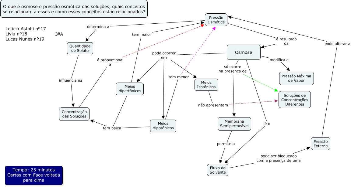 This Concept Map, created with IHMC CmapTools, has information related to: osmose 3ªA Leticia, Livia e Lucas, Osmose só ocorre na presença de Soluções de Concentrações Diferentes, Pressão Externa pode alterar a Pressão Osmótica, Concentração das Soluções é proporcional a Pressão Osmótica, Fluxo do Solvente pode ser bloqueado com a presença de uma Pressão Externa, Meios Hipotônicos tem baixa Concentração das Soluções, Meios Hipertônicos tem baixa Concentração das Soluções, Pressão Osmótica é resultado da Osmose, Osmose só ocorre na presença de Membrana Semipermeável, Pressão Osmótica determina a Quantidade de Soluto, Meios Isotônicos não apresentam Soluções de Concentrações Diferentes, Quantidade de Soluto influencia na Concentração das Soluções, Osmose pode ocorrer em Meios Hipotônicos, Osmose modifica a Pressão Máxima de Vapor, Membrana Semipermeável permite o Fluxo do Solvente, Osmose pode ocorrer em Meios Isotônicos, Osmose pode ocorrer em Meios Hipertônicos, Osmose é o Fluxo do Solvente, Meios Hipotônicos tem menor Pressão Osmótica, Meios Hipertônicos tem maior Pressão Osmótica