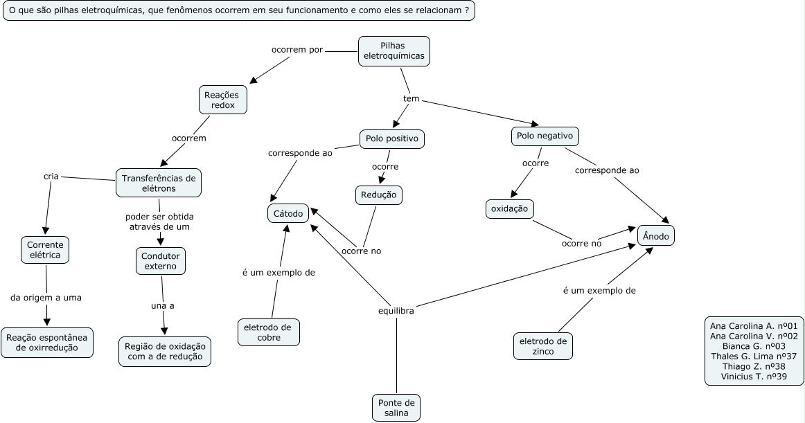 This Concept Map, created with IHMC CmapTools, has information related to: Pilhas eletroquimicas em grupo nº01,02,03,37,38,39, Polo negativo corresponde ao Ânodo, oxidação ocorre no Ânodo, Transferências de elétrons cria Corrente elétrica, Polo negativo ocorre oxidação, Ponte de salina equilibra Cátodo, Redução ocorre no Cátodo, Pilhas eletroquímicas tem Polo negativo, eletrodo de cobre é um exemplo de Cátodo, Transferências de elétrons poder ser obtida através de um Condutor externo, Ponte de salina equilibra Ânodo, Polo positivo ocorre Redução, Condutor externo una a Região de oxidação com a de redução, eletrodo de zinco é um exemplo de Ânodo, Pilhas eletroquímicas tem Polo positivo, Pilhas eletroquímicas ocorrem por Reações redox, Reações redox ocorrem Transferências de elétrons, Polo positivo corresponde ao Cátodo, Corrente elétrica da origem a uma Reação espontânea de oxirredução