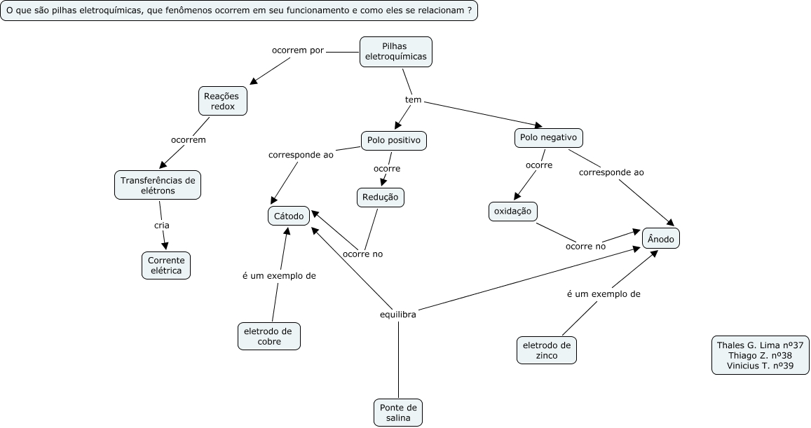 Esse mapa conceitual, produzido no IHMC CmapTools, tem a informação relacionada a: Pilhas eletroquimicas nº37,38,39, Polo negativo corresponde ao Ânodo, oxidação ocorre no Ânodo, Transferências de elétrons cria Corrente elétrica, Polo negativo ocorre oxidação, Ponte de salina equilibra Cátodo, Redução ocorre no Cátodo, Pilhas eletroquímicas tem Polo negativo, eletrodo de cobre é um exemplo de Cátodo, Ponte de salina equilibra Ânodo, Polo positivo ocorre Redução, eletrodo de zinco é um exemplo de Ânodo, Pilhas eletroquímicas tem Polo positivo, Pilhas eletroquímicas ocorrem por Reações redox, Reações redox ocorrem Transferências de elétrons, Polo positivo corresponde ao Cátodo