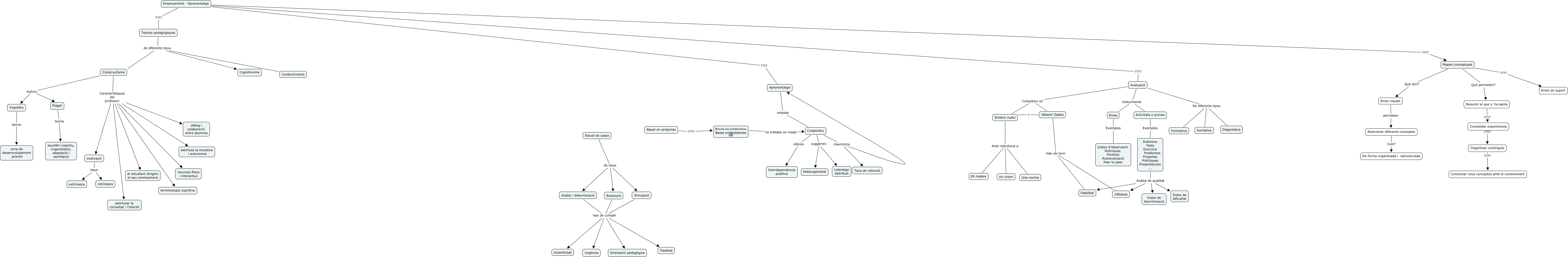 Este Cmap, tiene información relacionada con: Metodologies d'aprenentatge i mètodes d'avaluació, Piaget teoria equilibri cognitiu, organització, adaptació i asimilació, Mapes conceptuals Què són? Eines visuals, Constructisme Característiques del professor diàleg i colaboració entre alumnes, Avaluació Consisteix en Obtenir Dades, Cooperatiu suggereix Lideratge distribuit, Simulació han de complir Orientació pedagògica, motivació tipus intrínseca, Simulació han de complir Totalitat, Constructisme Característiques del professor terminologia cognitiva, Ensenyament - Aprenentatge ???? Mapes conceptuals, Consolidar experiències ???? Organitzar continguts, Aprenentatge mètode Cooperatiu, Exàmens Tests Exercicis Problemes Projectes Pràctiques Presentacions ... Anàlisi de qualitat Índex de discriminació, Diagnòstica De diferents tipus Avaluació, Constructisme Autors Piaget, Avaluació Insturments Eines, Emetre Judici Amb referència a Ell mateix, Anàlisi i determinació han de complir Autenticitat, Organitzar continguts ???? Connectar nous conceptes amb el coneixement, Avaluació Insturments Activitats o proves