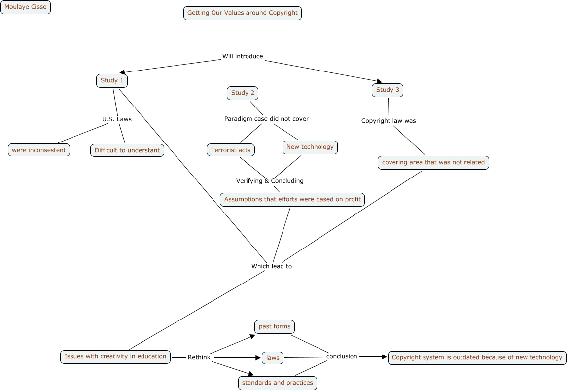 This Concept Map, created with IHMC CmapTools, has information related to: Moulaye Cisse, Getting Our Values around Copyright Will introduce Study 3, covering area that was not related Which lead to Issues with creativity in education, standards and practices conclusion Copyright system is outdated because of new technology, Issues with creativity in education Rethink laws, Assumptions that efforts were based on profit Which lead to Issues with creativity in education, Issues with creativity in education Rethink past forms, New technology Verifying & Concluding Assumptions that efforts were based on profit, past forms conclusion Copyright system is outdated because of new technology, Terrorist acts Verifying & Concluding Assumptions that efforts were based on profit, Study 2 Paradigm case did not cover New technology, Study 3 Copyright law was covering area that was not related, Study 2 Paradigm case did not cover Terrorist acts, Issues with creativity in education Rethink standards and practices, Study 1 U.S. Laws Difficult to understant, Getting Our Values around Copyright Will introduce Study 2, Study 1 Which lead to Issues with creativity in education, laws conclusion Copyright system is outdated because of new technology, Getting Our Values around Copyright Will introduce Study 1, Study 1 U.S. Laws were inconsestent