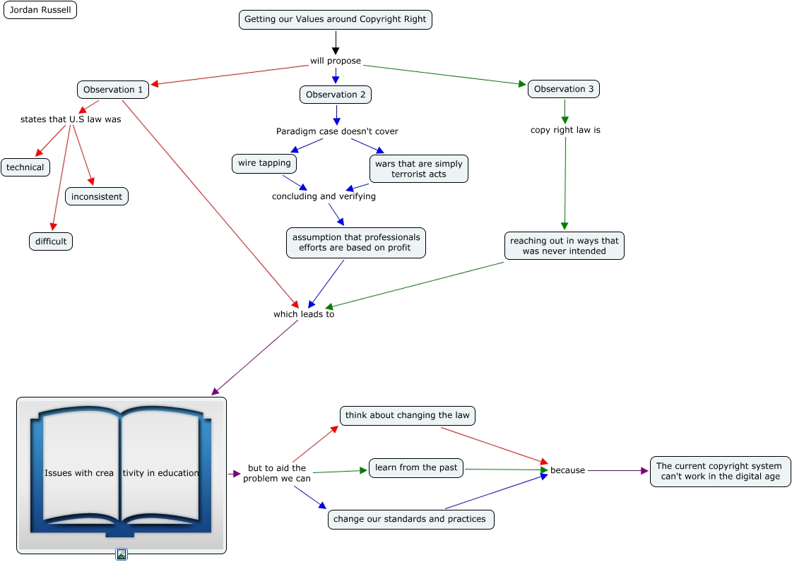 This Concept Map, created with IHMC CmapTools, has information related to: J.Russell, Observation 2 Paradigm case doesn't cover wire tapping, Issues with crea tivity in education but to aid the problem we can change our standards and practices, Getting our Values around Copyright Right will propose Observation 3, wire tapping concluding and verifying assumption that professionals efforts are based on profit, Getting our Values around Copyright Right will propose Observation 1, Issues with crea tivity in education but to aid the problem we can think about changing the law, learn from the past because The current copyright system can't work in the digital age, Observation 1 states that U.S law was technical, wars that are simply terrorist acts concluding and verifying assumption that professionals efforts are based on profit, assumption that professionals efforts are based on profit which leads to Issues with crea tivity in education, Issues with crea tivity in education but to aid the problem we can learn from the past, Observation 3 copy right law is reaching out in ways that was never intended, Observation 1 states that U.S law was difficult, think about changing the law because The current copyright system can't work in the digital age, change our standards and practices because The current copyright system can't work in the digital age, Observation 2 Paradigm case doesn't cover wars that are simply terrorist acts, reaching out in ways that was never intended which leads to Issues with crea tivity in education, Getting our Values around Copyright Right will propose Observation 2, Observation 1 states that U.S law was inconsistent, Observation 1 which leads to Issues with crea tivity in education