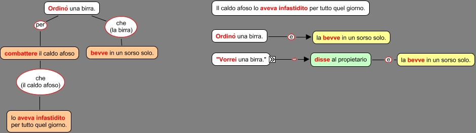Questa Cmap, creata con IHMC CmapTools, contiene informazioni relative a: John 02, disse al propietario e la bevve in un sorso solo., "Vorrei una birra." - disse al propietario, combattere il caldo afoso che (il caldo afoso) lo aveva infastidito per tutto quel giorno., Ordinò una birra. e la bevve in un sorso solo., Ordinò una birra. che (la birra) bevve in un sorso solo., Ordinò una birra. per combattere il caldo afoso