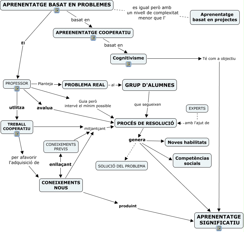 Este Cmap, tiene información relacionada con: ABP_basado_en_problemas_alberto, GRUP D'ALUMNES que segueixen PROCÉS DE RESOLUCIÓ, PROCÉS DE RESOLUCIÓ genera SOLUCIÓ DEL PROBLEMA, PROFESSOR utlitza TREBALL COOPERATIU, PROFESSOR avalua PROCÉS DE RESOLUCIÓ, PROCÉS DE RESOLUCIÓ genera APRENENTATGE SIGNIFICATIU, PROFESSOR Guia però intervé el mínim possible PROCÉS DE RESOLUCIÓ, PROFESSOR Planteja PROBLEMA REAL, PROCÉS DE RESOLUCIÓ genera Competèncias socials, CONEIXEMENTS PREVIS mitjantçant PROCÉS DE RESOLUCIÓ, EXPERTS amb l'ajut de PROCÉS DE RESOLUCIÓ, CONEIXEMENTS NOUS mitjantçant PROCÉS DE RESOLUCIÓ, APRENENTATGE BASAT EN PROBLEMES es igual però amb un nivell de complexitat menor que l' Aprenentatge basat en projectes, APRENENTATGE BASAT EN PROBLEMES basat en APREENENTATGE COOPERATIU, CONEIXEMENTS NOUS produint APRENENTATGE SIGNIFICATIU, PROCÉS DE RESOLUCIÓ genera Noves habilitats, TREBALL COOPERATIU per afavorir l'adquisició de CONEIXEMENTS NOUS, TREBALL COOPERATIU mitjantçant PROCÉS DE RESOLUCIÓ, Cognitivisme Té com a objectiu APRENENTATGE SIGNIFICATIU, PROBLEMA REAL al GRUP D'ALUMNES, APREENENTATGE COOPERATIU basat en Cognitivisme