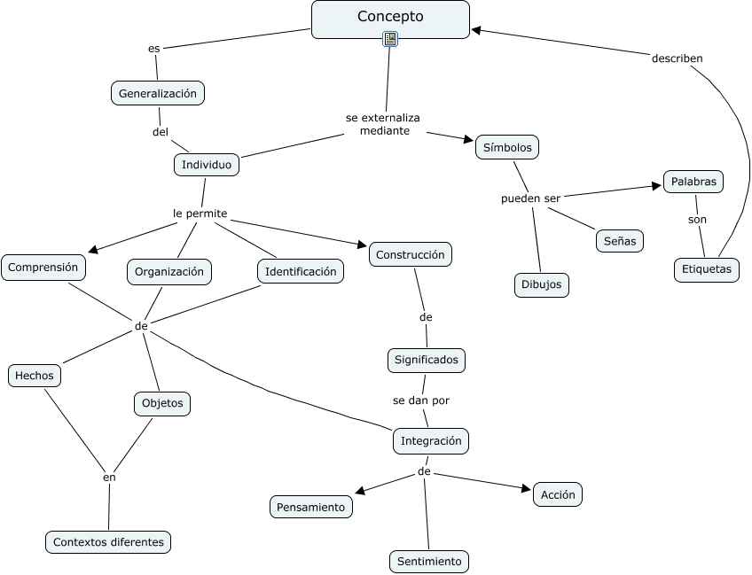 Este Cmap, tiene información relacionada con: Concepto, Construcción de Significados, Individuo se externaliza mediante Símbolos, Etiquetas describen Concepto, Individuo le permite Construcción, Palabras son Etiquetas, Identificación de Hechos, Organización de Objetos, Individuo le permite Comprensión, Concepto se externaliza mediante Símbolos, Organización de Hechos, Individuo le permite Identificación, Significados se dan por Integración, Identificación de Objetos, Integración de Hechos, Integración de Objetos, Individuo le permite Organización, Integración de Sentimiento, Concepto es Generalización, Hechos en Contextos diferentes, Comprensión de Objetos