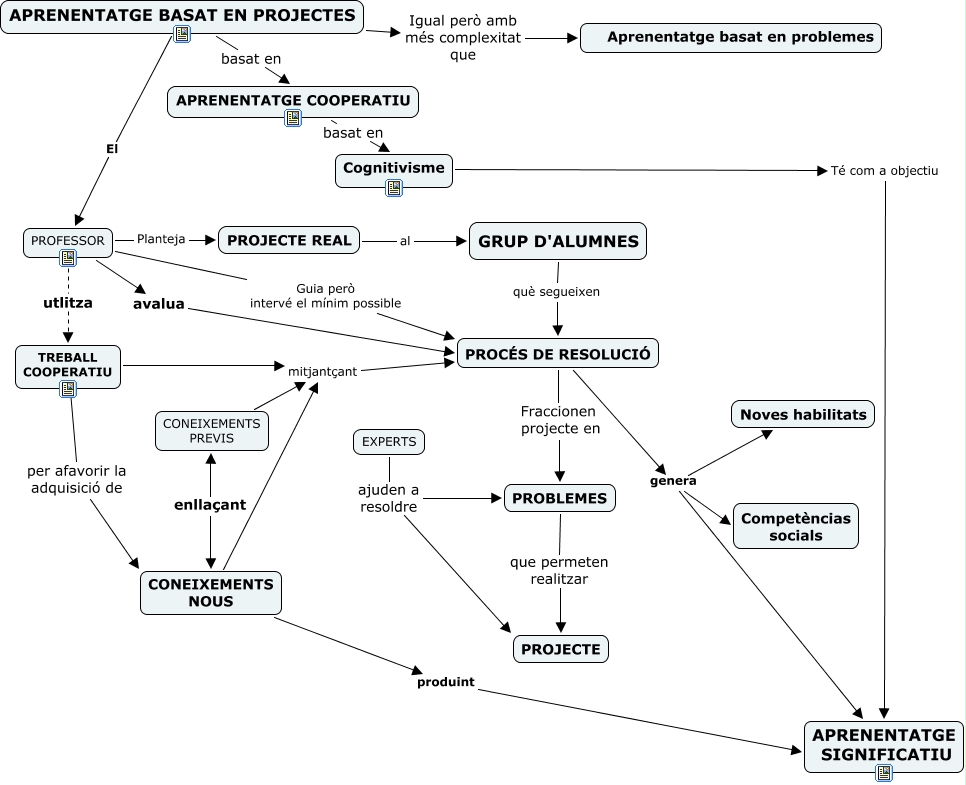 Este Cmap, tiene información relacionada con: Aprendizaje_basado_en_proyectos_alberto, GRUP D'ALUMNES què segueixen PROCÉS DE RESOLUCIÓ, TREBALL COOPERATIU per afavorir la adquisició de CONEIXEMENTS NOUS, PROFESSOR utlitza TREBALL COOPERATIU, PROFESSOR avalua PROCÉS DE RESOLUCIÓ, PROCÉS DE RESOLUCIÓ genera APRENENTATGE SIGNIFICATIU, PROFESSOR Guia però intervé el mínim possible PROCÉS DE RESOLUCIÓ, APRENENTATGE BASAT EN PROJECTES basat en APRENENTATGE COOPERATIU, PROFESSOR Planteja PROJECTE REAL, PROCÉS DE RESOLUCIÓ genera Competèncias socials, PROCÉS DE RESOLUCIÓ Fraccionen projecte en PROBLEMES, PROBLEMES que permeten realitzar PROJECTE, EXPERTS ajuden a resoldre PROJECTE, APRENENTATGE COOPERATIU basat en Cognitivisme, CONEIXEMENTS PREVIS mitjantçant PROCÉS DE RESOLUCIÓ, CONEIXEMENTS NOUS mitjantçant PROCÉS DE RESOLUCIÓ, APRENENTATGE BASAT EN PROJECTES Igual però amb més complexitat que Aprenentatge basat en problemes, CONEIXEMENTS NOUS produint APRENENTATGE SIGNIFICATIU, PROCÉS DE RESOLUCIÓ genera Noves habilitats, TREBALL COOPERATIU mitjantçant PROCÉS DE RESOLUCIÓ, Cognitivisme Té com a objectiu APRENENTATGE SIGNIFICATIU