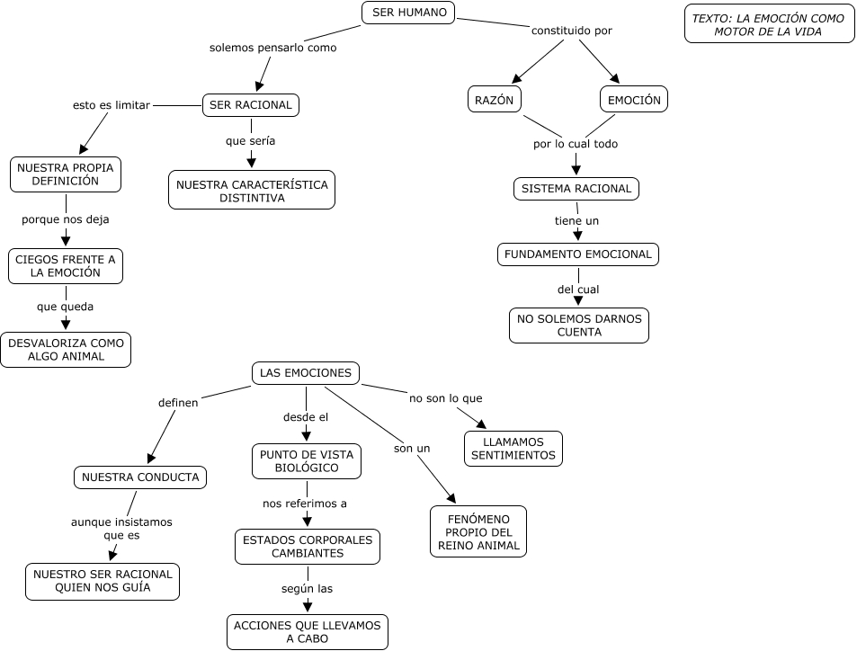 Este Cmap, tiene información relacionada con: SER HUMANO, NUESTRA PROPIA DEFINICIÓN porque nos deja CIEGOS FRENTE A LA EMOCIÓN, SER HUMANO solemos pensarlo como SER RACIONAL, SER HUMANO constituido por EMOCIÓN, FUNDAMENTO EMOCIONAL del cual NO SOLEMOS DARNOS CUENTA, CIEGOS FRENTE A LA EMOCIÓN que queda DESVALORIZA COMO ALGO ANIMAL, ESTADOS CORPORALES CAMBIANTES según las ACCIONES QUE LLEVAMOS A CABO, PUNTO DE VISTA BIOLÓGICO nos referimos a ESTADOS CORPORALES CAMBIANTES, LAS EMOCIONES no son lo que LLAMAMOS SENTIMIENTOS, LAS EMOCIONES son un FENÓMENO PROPIO DEL REINO ANIMAL, LAS EMOCIONES desde el PUNTO DE VISTA BIOLÓGICO, SISTEMA RACIONAL tiene un FUNDAMENTO EMOCIONAL, SER RACIONAL esto es limitar NUESTRA PROPIA DEFINICIÓN, EMOCIÓN por lo cual todo SISTEMA RACIONAL, SER RACIONAL que sería NUESTRA CARACTERÍSTICA DISTINTIVA, SER HUMANO constituido por RAZÓN, NUESTRA CONDUCTA aunque insistamos que es NUESTRO SER RACIONAL QUIEN NOS GUÍA, LAS EMOCIONES definen NUESTRA CONDUCTA, RAZÓN por lo cual todo SISTEMA RACIONAL