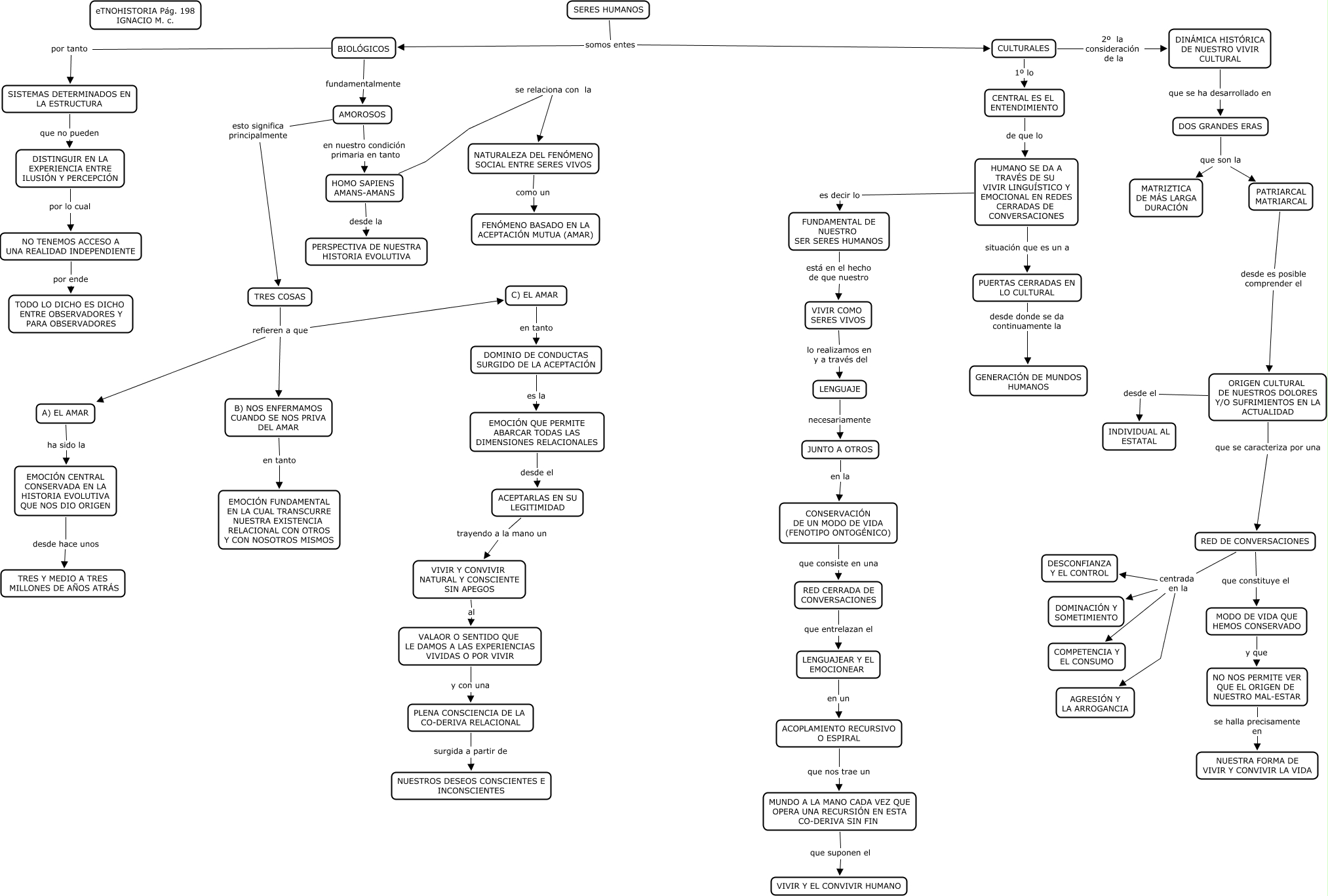 Este Cmap, tiene información relacionada con: SERES HUMANOS etnohistoria, EMOCIÓN CENTRAL CONSERVADA EN LA HISTORIA EVOLUTIVA QUE NOS DIO ORIGEN desde hace unos TRES Y MEDIO A TRES MILLONES DE AÑOS ATRÁS, VALAOR O SENTIDO QUE LE DAMOS A LAS EXPERIENCIAS VIVIDAS O POR VIVIR y con una PLENA CONSCIENCIA DE LA CO-DERIVA RELACIONAL, HOMO SAPIENS AMANS-AMANS se relaciona con la NATURALEZA DEL FENÓMENO SOCIAL ENTRE SERES VIVOS, RED DE CONVERSACIONES centrada en la DOMINACIÓN Y SOMETIMIENTO, SISTEMAS DETERMINADOS EN LA ESTRUCTURA que no pueden DISTINGUIR EN LA EXPERIENCIA ENTRE ILUSIÓN Y PERCEPCIÓN, ACEPTARLAS EN SU LEGITIMIDAD trayendo a la mano un VIVIR Y CONVIVIR NATURAL Y CONSCIENTE SIN APEGOS, ORIGEN CULTURAL DE NUESTROS DOLORES Y/O SUFRIMIENTOS EN LA ACTUALIDAD desde el INDIVIDUAL AL ESTATAL, LENGUAJEAR Y EL EMOCIONEAR en un ACOPLAMIENTO RECURSIVO O ESPIRAL, CENTRAL ES EL ENTENDIMIENTO de que lo HUMANO SE DA A TRAVÉS DE SU VIVIR LINGUÍSTICO Y EMOCIONAL EN REDES CERRADAS DE CONVERSACIONES, B) NOS ENFERMAMOS CUANDO SE NOS PRIVA DEL AMAR en tanto EMOCIÓN FUNDAMENTAL EN LA CUAL TRANSCURRE NUESTRA EXISTENCIA RELACIONAL CON OTROS Y CON NOSOTROS MISMOS, JUNTO A OTROS en la CONSERVACIÓN DE UN MODO DE VIDA (FENOTIPO ONTOGÉNICO), DISTINGUIR EN LA EXPERIENCIA ENTRE ILUSIÓN Y PERCEPCIÓN por lo cual NO TENEMOS ACCESO A UNA REALIDAD INDEPENDIENTE, PATRIARCAL MATRIARCAL desde es posible comprender el ORIGEN CULTURAL DE NUESTROS DOLORES Y/O SUFRIMIENTOS EN LA ACTUALIDAD, NATURALEZA DEL FENÓMENO SOCIAL ENTRE SERES VIVOS como un FENÓMENO BASADO EN LA ACEPTACIÓN MUTUA (AMAR), TRES COSAS refieren a que B) NOS ENFERMAMOS CUANDO SE NOS PRIVA DEL AMAR, RED DE CONVERSACIONES centrada en la COMPETENCIA Y EL CONSUMO, VIVIR COMO SERES VIVOS lo realizamos en y a través del LENGUAJE, TRES COSAS refieren a que A) EL AMAR, DOMINIO DE CONDUCTAS SURGIDO DE LA ACEPTACIÓN es la EMOCIÓN QUE PERMITE ABARCAR TODAS LAS DIMENSIONES RELACIONALES, NO NOS PERMITE VER QUE EL ORIGEN DE NUESTRO MAL-ESTAR se halla precisamente en NUESTRA FORMA DE VIVIR Y CONVIVIR LA VIDA