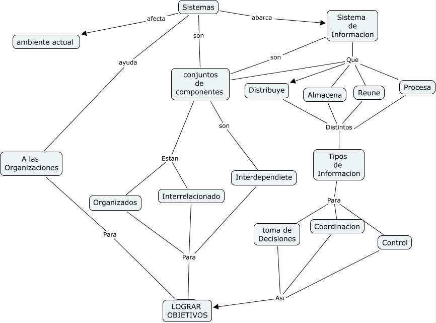 Este Cmap, tiene información relacionada con: Sistema y sistema de informacion, conjuntos de componentes Estan Interrelacionado, toma de Decisiones Asi LOGRAR OBJETIVOS, Reune Distintos Tipos de Informacion, Distribuye Distintos Tipos de Informacion, conjuntos de componentes son Interdependiete, Sistemas abarca Sistema de Informacion, A las Organizaciones Para LOGRAR OBJETIVOS, Interdependiete Para LOGRAR OBJETIVOS, Sistemas afecta ambiente actual, Sistema de Informacion Que Procesa, Control Asi LOGRAR OBJETIVOS, Sistema de Informacion son conjuntos de componentes, Almacena Distintos Tipos de Informacion, Sistemas son conjuntos de componentes, Sistema de Informacion Que Distribuye, conjuntos de componentes Que Distribuye, conjuntos de componentes Que Procesa, Tipos de Informacion Para Coordinacion, Coordinacion Asi LOGRAR OBJETIVOS, Sistema de Informacion Que Almacena