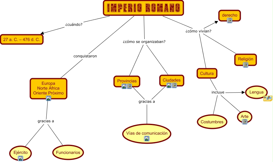 Este Cmap, tiene información relacionada con: Imperio Romano, IMPERIO ROMANO ¿cómo vivían? Cultura, Europa Norte África Oriente Próximo gracias a Ejército, IMPERIO ROMANO ¿cómo se organizaban? Ciudades, Ciudades gracias a Vías de comunicación, IMPERIO ROMANO ¿cómo vivían? derecho, IMPERIO ROMANO ¿cómo vivían? Religión, Cultura incluye Costumbres, Cultura incluye Arte, IMPERIO ROMANO ¿cómo se organizaban? Provincias, IMPERIO ROMANO conquistaron Europa Norte África Oriente Próximo, Cultura incluye Lengua, Europa Norte África Oriente Próximo gracias a Funcionarios, IMPERIO ROMANO ¿cuándo? 27 a. C. – 476 d. C., Provincias gracias a Vías de comunicación