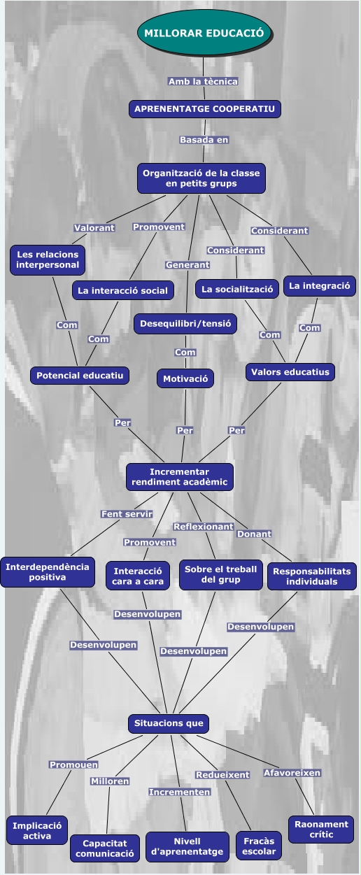 Este Cmap, tiene información relacionada con: Aprenentatge cooperatiu, Situacions que Milloren Capacitat comunicació, Incrementar rendiment acadèmic Reflexionant Sobre el treball del grup, La interacció social Com Potencial educatiu, Incrementar rendiment acadèmic Fent servir Interdependència positiva, Organització de la classe en petits grups Valorant Les relacions interpersonal, Interdependència positiva Desenvolupen Situacions que, Incrementar rendiment acadèmic Donant Responsabilitats individuals, La integració Com Valors educatius, La socialització Com Valors educatius, Situacions que Promouen Implicació activa, Situacions que Afavoreixen Raonament crític, Valors educatius Per Incrementar rendiment acadèmic, Organització de la classe en petits grups Considerant La integració, Desequilibri/tensió Com Motivació, Les relacions interpersonal Com Potencial educatiu, APRENENTATGE COOPERATIU Basada en Organització de la classe en petits grups, Organització de la classe en petits grups Promovent La interacció social, Potencial educatiu Per Incrementar rendiment acadèmic, MILLORAR EDUCACIÓ Amb la tècnica APRENENTATGE COOPERATIU, Situacions que Redueixent Fracàs escolar