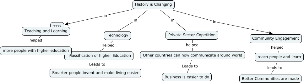This Concept Map, created with IHMC CmapTools, has information related to: john duthie, History is Changing in ????, reach people and learn leads to Better Communities are made, History is Changing in Private Sector Copetition, "Massification of higher Education Leads to Smarter people invent and make living easier, Other countries can now communicate around world Leads to Business is easier to do, History is Changing in Technology, Technology Helped "Massification of higher Education, Private Sector Copetition helped Other countries can now communicate around world, Community Engagement helped reach people and learn, Teaching and Learning helped more people with higher education, History is Changing in Community Engagement