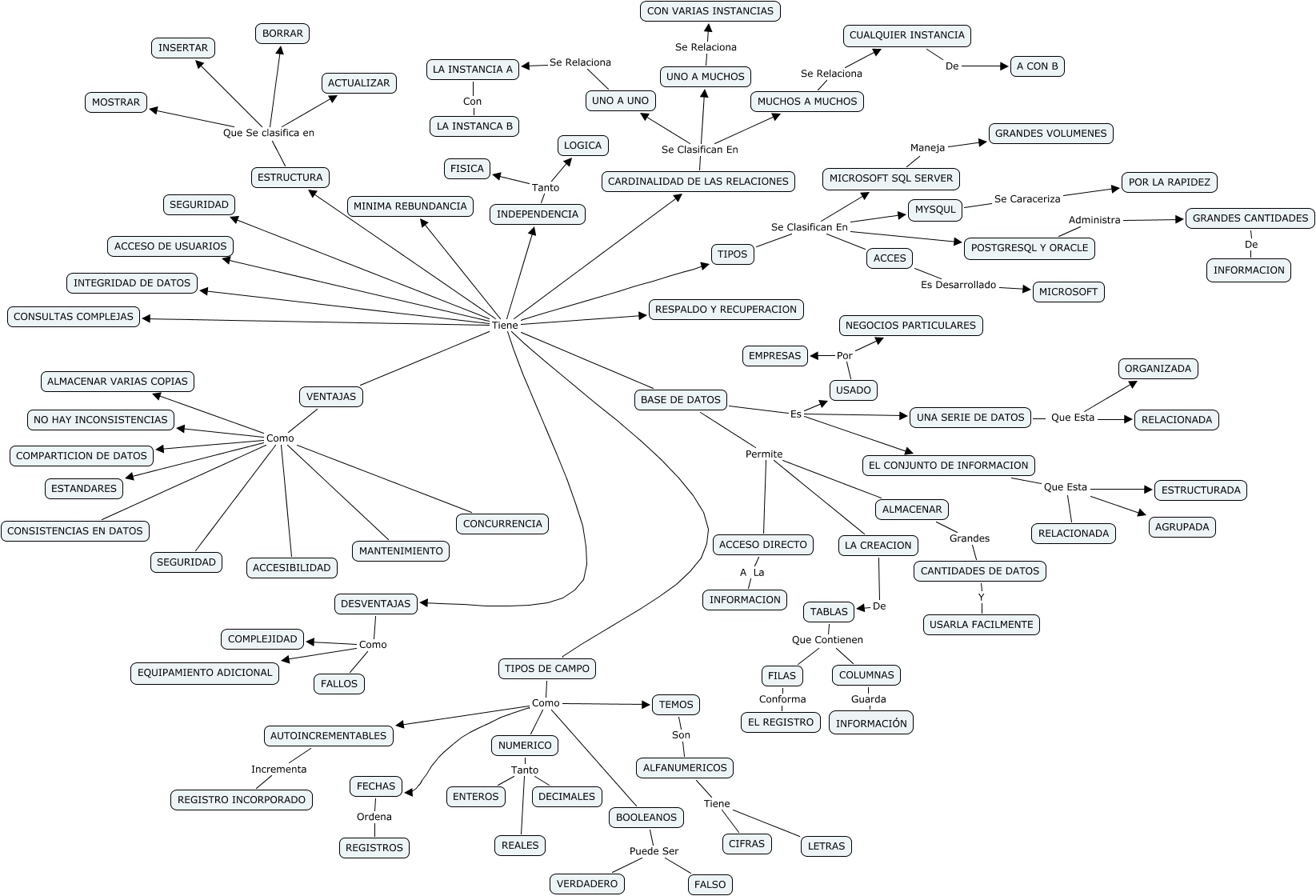 Este Cmap, tiene información relacionada con: Base De Datos-Juan Sebastian Salas, BASE DE DATOS Tiene RESPALDO Y RECUPERACION, ESTRUCTURA Que Se clasifica en INSERTAR, TIPOS DE CAMPO Como TEMOS, TIPOS DE CAMPO Como NUMERICO, BASE DE DATOS Tiene ESTRUCTURA, TIPOS Se Clasifican En MICROSOFT SQL SERVER, DESVENTAJAS Como EQUIPAMIENTO ADICIONAL, INDEPENDENCIA Tanto FISICA, MUCHOS A MUCHOS Se Relaciona CUALQUIER INSTANCIA, BASE DE DATOS Permite LA CREACION, LA INSTANCIA A Con LA INSTANCA B, EL CONJUNTO DE INFORMACION Que Esta ESTRUCTURADA, TABLAS Que Contienen FILAS, ACCES Es Desarrollado MICROSOFT, BASE DE DATOS Tiene INDEPENDENCIA, BASE DE DATOS Es UNA SERIE DE DATOS, ESTRUCTURA Que Se clasifica en MOSTRAR, UNO A MUCHOS Se Relaciona CON VARIAS INSTANCIAS, INDEPENDENCIA Tanto LOGICA, TIPOS Se Clasifican En POSTGRESQL Y ORACLE
