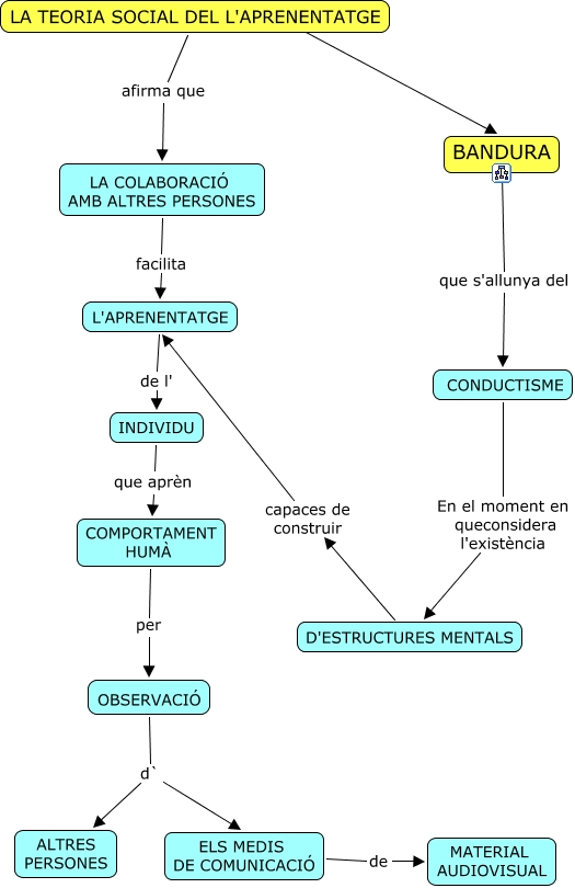 Este Cmap, tiene información relacionada con: Teoria social del aprenentatge Albert Bandura, COMPORTAMENT HUMÀ per OBSERVACIÓ, D'ESTRUCTURES MENTALS capaces de construir L'APRENENTATGE, BANDURA que s'allunya del CONDUCTISME, L'APRENENTATGE de l' INDIVIDU, OBSERVACIÓ d` ELS MEDIS DE COMUNICACIÓ, CONDUCTISME En el moment en queconsidera l'existència D'ESTRUCTURES MENTALS, ELS MEDIS DE COMUNICACIÓ de MATERIAL AUDIOVISUAL, LA COLABORACIÓ AMB ALTRES PERSONES facilita L'APRENENTATGE, INDIVIDU que aprèn COMPORTAMENT HUMÀ, LA TEORIA SOCIAL DEL L'APRENENTATGE ???? BANDURA, LA TEORIA SOCIAL DEL L'APRENENTATGE afirma que LA COLABORACIÓ AMB ALTRES PERSONES, OBSERVACIÓ d` ALTRES PERSONES