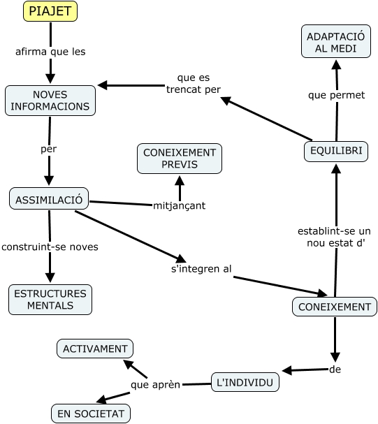 Este Cmap, tiene información relacionada con: CMAP APRENENTATGE SEGONS PIAGET, ASSIMILACIÓ s'integren al CONEIXEMENT, L'INDIVIDU que aprèn EN SOCIETAT, NOVES INFORMACIONS per ASSIMILACIÓ, CONEIXEMENT establint-se un nou estat d' EQUILIBRI, PIAJET afirma que les NOVES INFORMACIONS, EQUILIBRI que permet ADAPTACIÓ AL MEDI, ASSIMILACIÓ mitjançant CONEIXEMENT PREVIS, L'INDIVIDU que aprèn ACTIVAMENT, EQUILIBRI que es trencat per NOVES INFORMACIONS, ASSIMILACIÓ construint-se noves ESTRUCTURES MENTALS, CONEIXEMENT de L'INDIVIDU