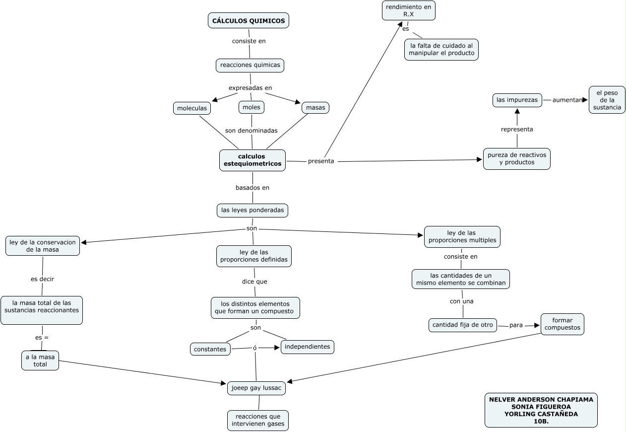Este Cmap, tiene información relacionada con: estequiometria, ley de la conservacion de la masa es decir la masa total de las sustancias reaccionantes, las leyes ponderadas son ley de las proporciones multiples, formar compuestos ???? joeep gay lussac, masas ???? calculos estequiometricos, calculos estequiometricos presenta rendimiento en R.X, las leyes ponderadas son ley de la conservacion de la masa, calculos estequiometricos basados en las leyes ponderadas, joeep gay lussac ???? reacciones que intervienen gases, las leyes ponderadas son ley de las proporciones definidas, las impurezas aumentan el peso de la sustancia, reacciones quimicas expresadas en moles, las cantidades de un mismo elemento se combinan con una cantidad fija de otro, pureza de reactivos y productos representa las impurezas, ley de las proporciones definidas dice que los distintos elementos que forman un compuesto, los distintos elementos que forman un compuesto son constantes, CÁLCULOS QUIMICOS consiste en reacciones quimicas, a la masa total ???? ????, calculos estequiometricos presenta pureza de reactivos y productos, reacciones quimicas expresadas en masas, la masa total de las sustancias reaccionantes es = a la masa total