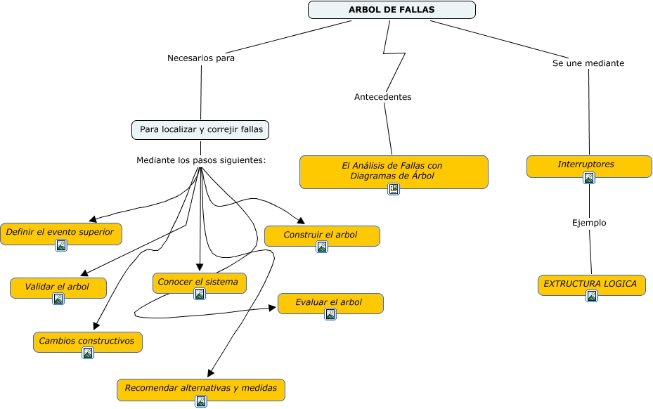 Este Cmap, tiene información relacionada con: conocer el sistema, El Análisis de Fallas con Diagramas de Árbol Antecedentes ARBOL DE FALLAS, ARBOL DE FALLAS Necesarios para Para localizar y correjir fallas, Para localizar y correjir fallas Mediante los pasos siguientes: Validar el arbol, ARBOL DE FALLAS Se une mediante Interruptores, Para localizar y correjir fallas Mediante los pasos siguientes: Conocer el sistema, Para localizar y correjir fallas Mediante los pasos siguientes: Recomendar alternativas y medidas, Para localizar y correjir fallas Mediante los pasos siguientes: Cambios constructivos, Para localizar y correjir fallas Mediante los pasos siguientes: Definir el evento superior, Interruptores Ejemplo EXTRUCTURA LOGICA, Para localizar y correjir fallas Mediante los pasos siguientes: Evaluar el arbol, Para localizar y correjir fallas Mediante los pasos siguientes: Construir el arbol
