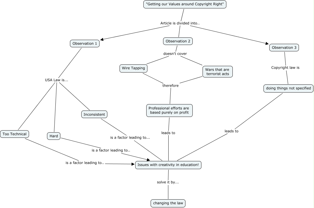 This Concept Map, created with IHMC CmapTools, has information related to: NolanHigh and RobOtto, Observation 2 doesn't cover Wars that are terrorist acts, "Getting our Values around Copyright Right" Article is divided into.. Observation 2, Observation 1 USA Law is... Hard, Hard is a factor leading to.. Issues with creativity in education!, "Getting our Values around Copyright Right" Article is divided into.. Observation 1, Wars that are terrorist acts therefore Professional efforts are based purely on profit, Observation 2 doesn't cover Wire Tapping, doing things not specified leads to Issues with creativity in education!, Wire Tapping therefore Professional efforts are based purely on profit, Issues with creativity in education! solve it by... changing the law, Professional efforts are based purely on profit leads to Issues with creativity in education!, Inconsistent is a factor leading to... Issues with creativity in education!, Observation 1 USA Law is... Too Technical, Too Technical is a factor leading to.. Issues with creativity in education!, Observation 1 USA Law is... Inconsistent, Observation 3 Copyright law is doing things not specified, "Getting our Values around Copyright Right" Article is divided into.. Observation 3