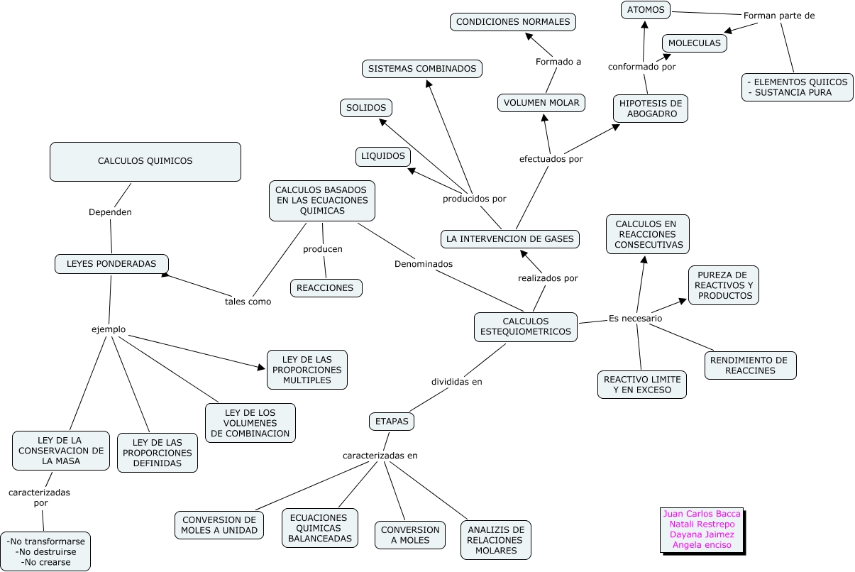 Este Cmap, tiene información relacionada con: Juan Carlos Bacca, LA INTERVENCION DE GASES producidos por LIQUIDOS, LEYES PONDERADAS ejemplo LEY DE LAS PROPORCIONES DEFINIDAS, CALCULOS ESTEQUIOMETRICOS Es necesario REACTIVO LIMITE Y EN EXCESO, ATOMOS Forman parte de MOLECULAS, HIPOTESIS DE ABOGADRO conformado por MOLECULAS, ATOMOS Forman parte de - ELEMENTOS QUIICOS - SUSTANCIA PURA, ETAPAS caracterizadas en CONVERSION A MOLES, LEYES PONDERADAS ejemplo LEY DE LAS PROPORCIONES MULTIPLES, CALCULOS BASADOS EN LAS ECUACIONES QUIMICAS tales como LEYES PONDERADAS, HIPOTESIS DE ABOGADRO conformado por ATOMOS, VOLUMEN MOLAR Formado a CONDICIONES NORMALES, LEY DE LA CONSERVACION DE LA MASA caracterizadas por -No transformarse -No destruirse -No crearse, CALCULOS ESTEQUIOMETRICOS Es necesario PUREZA DE REACTIVOS Y PRODUCTOS, CALCULOS QUIMICOS Dependen LEYES PONDERADAS, LA INTERVENCION DE GASES producidos por SISTEMAS COMBINADOS, LEYES PONDERADAS ejemplo LEY DE LA CONSERVACION DE LA MASA, ETAPAS caracterizadas en ECUACIONES QUIMICAS BALANCEADAS, LA INTERVENCION DE GASES producidos por SOLIDOS, LEYES PONDERADAS ejemplo LEY DE LOS VOLUMENES DE COMBINACION, LA INTERVENCION DE GASES efectuados por HIPOTESIS DE ABOGADRO