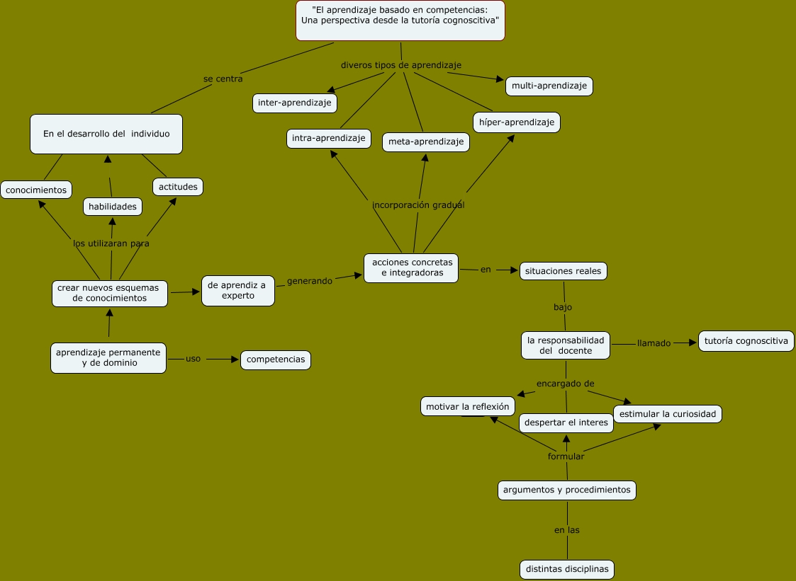 Este Cmap, tiene información relacionada con: el aprendizaje basado en competencias, la responsabilidad del docente llamado tutoría cognoscitiva, la responsabilidad del docente encargado de despertar el interes, de aprendiz a experto generando acciones concretas e integradoras, crear nuevos esquemas de conocimientos los utilizaran para habilidades, argumentos y procedimientos formular despertar el interes, la responsabilidad del docente encargado de estimular la curiosidad, En el desarrollo del individuo ???? actitudes, aprendizaje permanente y de dominio uso competencias, acciones concretas e integradoras intra-aprendizaje, situaciones reales bajo la responsabilidad del docente, acciones concretas e integradoras híper-aprendizaje, crear nuevos esquemas de conocimientos conocimientos, crear nuevos esquemas de conocimientos actitudes, "El aprendizaje basado en competencias: Una perspectiva desde la tutoría cognoscitiva" diveros tipos de aprendizaje híper-aprendizaje, "El aprendizaje basado en competencias: Una perspectiva desde la tutoría cognoscitiva" diveros tipos de aprendizaje multi-aprendizaje, "El aprendizaje basado en competencias: Una perspectiva desde la tutoría cognoscitiva" diveros tipos de aprendizaje meta-aprendizaje, "El aprendizaje basado en competencias: Una perspectiva desde la tutoría cognoscitiva" se centra En el desarrollo del individuo, crear nuevos esquemas de conocimientos ???? de aprendiz a experto, En el desarrollo del individuo ???? conocimientos, "El aprendizaje basado en competencias: Una perspectiva desde la tutoría cognoscitiva" diveros tipos de aprendizaje intra-aprendizaje