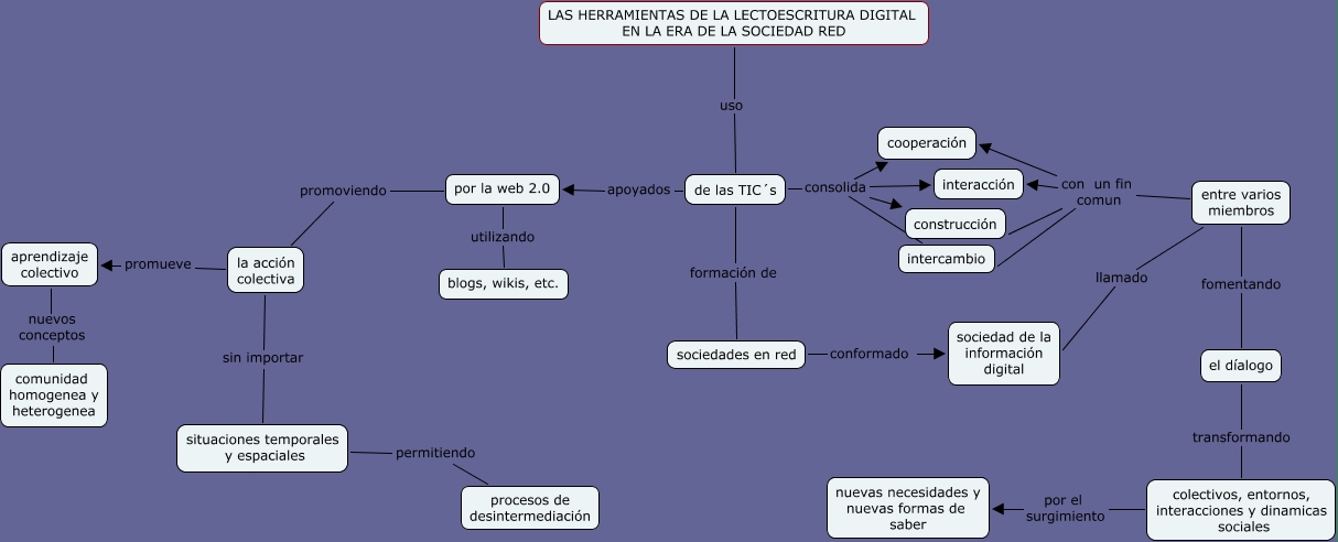 Este Cmap, tiene información relacionada con: Las herramientas como lectoescritura digital, entre varios miembros fomentando el díalogo, situaciones temporales y espaciales permitiendo procesos de desintermediación, aprendizaje colectivo nuevos conceptos comunidad homogenea y heterogenea, el díalogo transformando colectivos, entornos, interacciones y dinamicas sociales, de las TIC´s consolida cooperación, entre varios miembros llamado sociedad de la información digital, colectivos, entornos, interacciones y dinamicas sociales por el surgimiento nuevas necesidades y nuevas formas de saber, de las TIC´s consolida interacción, de las TIC´s consolida intercambio, de las TIC´s consolida construcción, por la web 2.0 utilizando blogs, wikis, etc., LAS HERRAMIENTAS DE LA LECTOESCRITURA DIGITAL EN LA ERA DE LA SOCIEDAD RED uso de las TIC´s, sociedades en red conformado sociedad de la información digital, entre varios miembros con un fin comun cooperación, entre varios miembros con un fin comun interacción, entre varios miembros con un fin comun construcción, por la web 2.0 promoviendo la acción colectiva, la acción colectiva promueve aprendizaje colectivo, la acción colectiva sin importar situaciones temporales y espaciales, de las TIC´s formación de sociedades en red