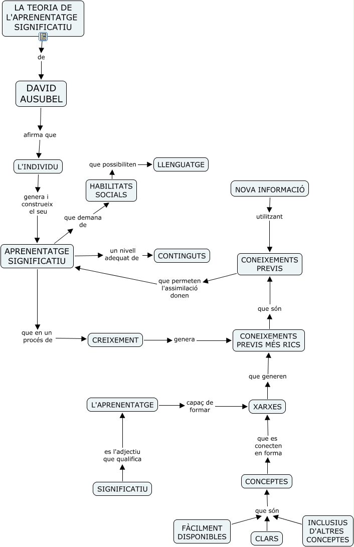Este Cmap, tiene información relacionada con: Perspectiva aubeliana del aprenentatge, XARXES que generen CONEIXEMENTS PREVIS MÉS RICS, L'APRENENTATGE capaç de formar XARXES, APRENENTATGE SIGNIFICATIU que en un procés de CREIXEMENT, SIGNIFICATIU es l'adjectiu que qualifica L'APRENENTATGE, L'INDIVIDU genera i construeix el seu APRENENTATGE SIGNIFICATIU, CONEIXEMENTS PREVIS MÉS RICS que són CONEIXEMENTS PREVIS, APRENENTATGE SIGNIFICATIU que demana de HABILITATS SOCIALS, APRENENTATGE SIGNIFICATIU un nivell adequat de CONTINGUTS, HABILITATS SOCIALS que possibiliten LLENGUATGE, CONCEPTES que es conecten en forma XARXES, NOVA INFORMACIÓ utilitzant CONEIXEMENTS PREVIS, INCLUSIUS D'ALTRES CONCEPTES que són CONCEPTES, FÀCILMENT DISPONIBLES que són CONCEPTES, CONEIXEMENTS PREVIS que permeten l'assimilació donen APRENENTATGE SIGNIFICATIU, CREIXEMENT genera CONEIXEMENTS PREVIS MÉS RICS, CLARS que són CONCEPTES, LA TEORIA DE L'APRENENTATGE SIGNIFICATIU de DAVID AUSUBEL, DAVID AUSUBEL afirma que L'INDIVIDU