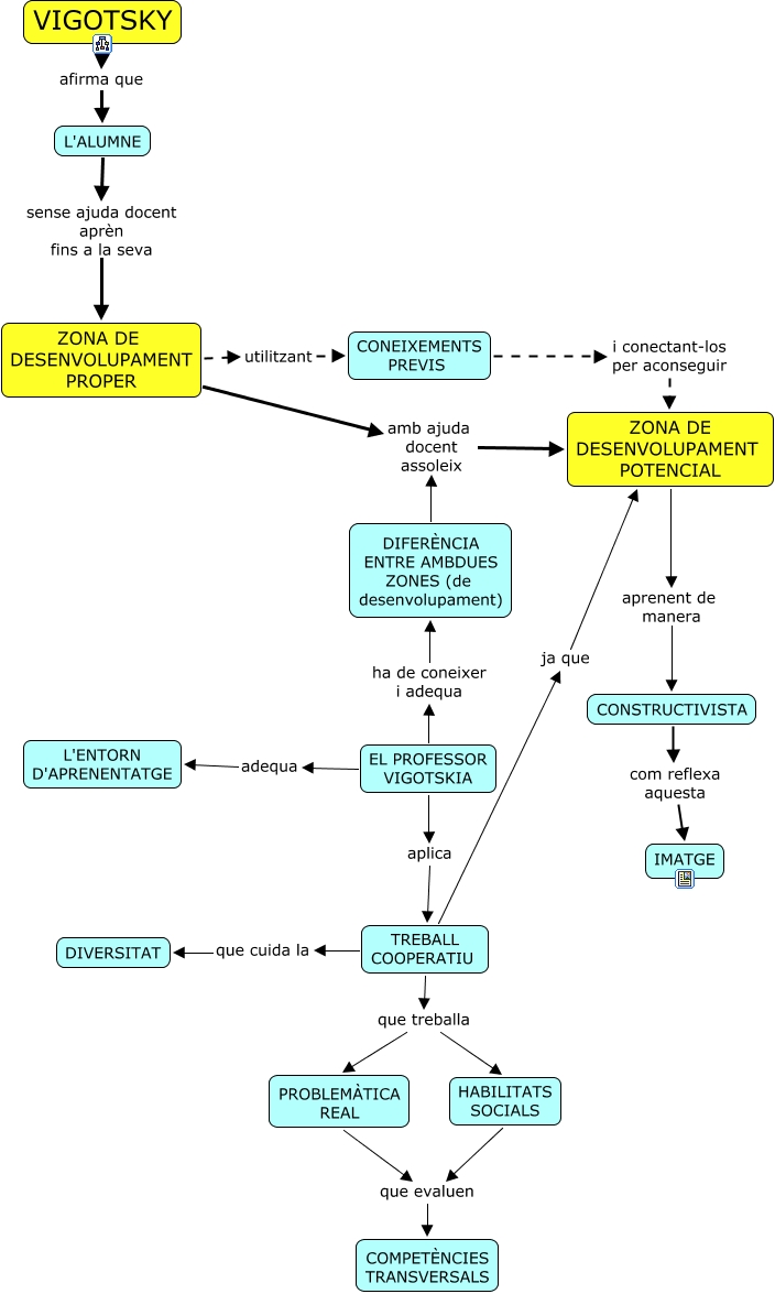 Este Cmap, tiene información relacionada con: CMAP L'aprenentatge segons Vigotsky, CONSTRUCTIVISTA com reflexa aquesta IMATGE, CONEIXEMENTS PREVIS i conectant-los per aconseguir ZONA DE DESENVOLUPAMENT POTENCIAL, DIFERÈNCIA ENTRE AMBDUES ZONES (de desenvolupament) amb ajuda docent assoleix ZONA DE DESENVOLUPAMENT POTENCIAL, VIGOTSKY afirma que L'ALUMNE, ZONA DE DESENVOLUPAMENT POTENCIAL aprenent de manera CONSTRUCTIVISTA, HABILITATS SOCIALS que evaluen COMPETÈNCIES TRANSVERSALS, L'ALUMNE sense ajuda docent aprèn fins a la seva ZONA DE DESENVOLUPAMENT PROPER, ZONA DE DESENVOLUPAMENT PROPER utilitzant CONEIXEMENTS PREVIS, EL PROFESSOR VIGOTSKIA ha de coneixer i adequa DIFERÈNCIA ENTRE AMBDUES ZONES (de desenvolupament), TREBALL COOPERATIU que treballa HABILITATS SOCIALS, EL PROFESSOR VIGOTSKIA adequa L'ENTORN D'APRENENTATGE, TREBALL COOPERATIU que treballa PROBLEMÀTICA REAL, EL PROFESSOR VIGOTSKIA aplica TREBALL COOPERATIU, TREBALL COOPERATIU que cuida la DIVERSITAT, PROBLEMÀTICA REAL que evaluen COMPETÈNCIES TRANSVERSALS, ZONA DE DESENVOLUPAMENT PROPER amb ajuda docent assoleix ZONA DE DESENVOLUPAMENT POTENCIAL, TREBALL COOPERATIU ja que ZONA DE DESENVOLUPAMENT POTENCIAL