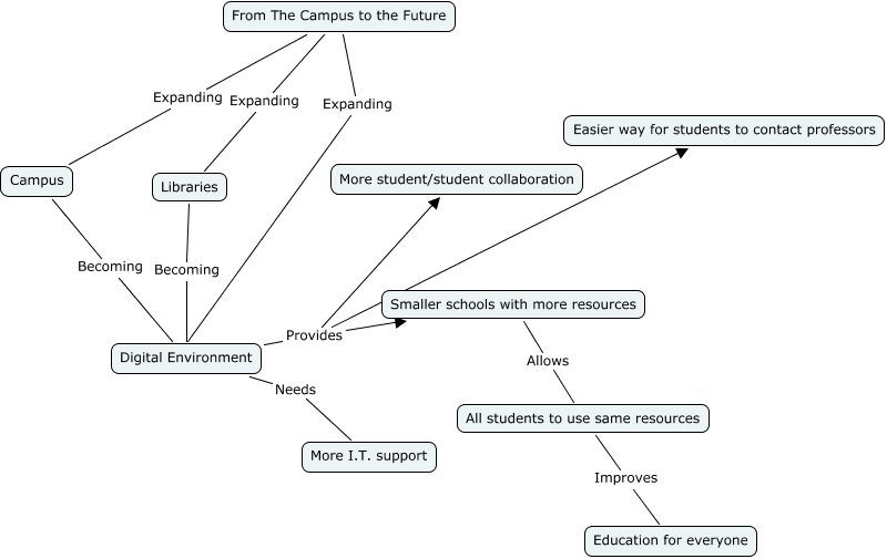This Concept Map, created with IHMC CmapTools, has information related to: StephenSherrard, From The Campus to the Future Expanding Libraries, From The Campus to the Future Expanding Digital Environment, Campus Becoming Digital Environment, Digital Environment Needs More I.T. support, Digital Environment Provides More student/student collaboration, All students to use same resources Improves Education for everyone, Smaller schools with more resources Allows All students to use same resources, Digital Environment Provides Easier way for students to contact professors, Libraries Becoming Digital Environment, From The Campus to the Future Expanding Campus, Digital Environment Provides Smaller schools with more resources