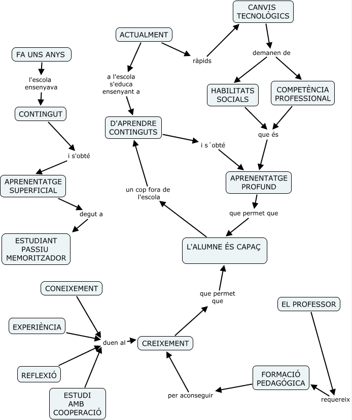 Este Cmap, tiene información relacionada con: Raons per canviar la forma d´ensenyar.cmap, FA UNS ANYS l'escola ensenyava CONTINGUT, CREIXEMENT que permet que L'ALUMNE ÉS CAPAÇ, EXPERIÈNCIA duen al CREIXEMENT, FORMACIÓ PEDAGÒGICA per aconseguir CREIXEMENT, CANVIS TECNOLÒGICS demanen de COMPETÈNCIA PROFESSIONAL, ACTUALMENT a l'escola s'educa ensenyant a D'APRENDRE CONTINGUTS, HABILITATS SOCIALS que és APRENENTATGE PROFUND, APRENENTATGE PROFUND que permet que L'ALUMNE ÉS CAPAÇ, CONTINGUT i s'obté APRENENTATGE SUPERFICIAL, APRENENTATGE SUPERFICIAL degut a ESTUDIANT PASSIU MEMORITZADOR, COMPETÈNCIA PROFESSIONAL que és APRENENTATGE PROFUND, ESTUDI AMB COOPERACIÓ duen al CREIXEMENT, CONEIXEMENT duen al CREIXEMENT, D'APRENDRE CONTINGUTS i s´obté APRENENTATGE PROFUND, CANVIS TECNOLÒGICS demanen de HABILITATS SOCIALS, L'ALUMNE ÉS CAPAÇ un cop fora de l'escola D'APRENDRE CONTINGUTS, EL PROFESSOR requereix FORMACIÓ PEDAGÒGICA, ACTUALMENT ràpids CANVIS TECNOLÒGICS, REFLEXIÓ duen al CREIXEMENT