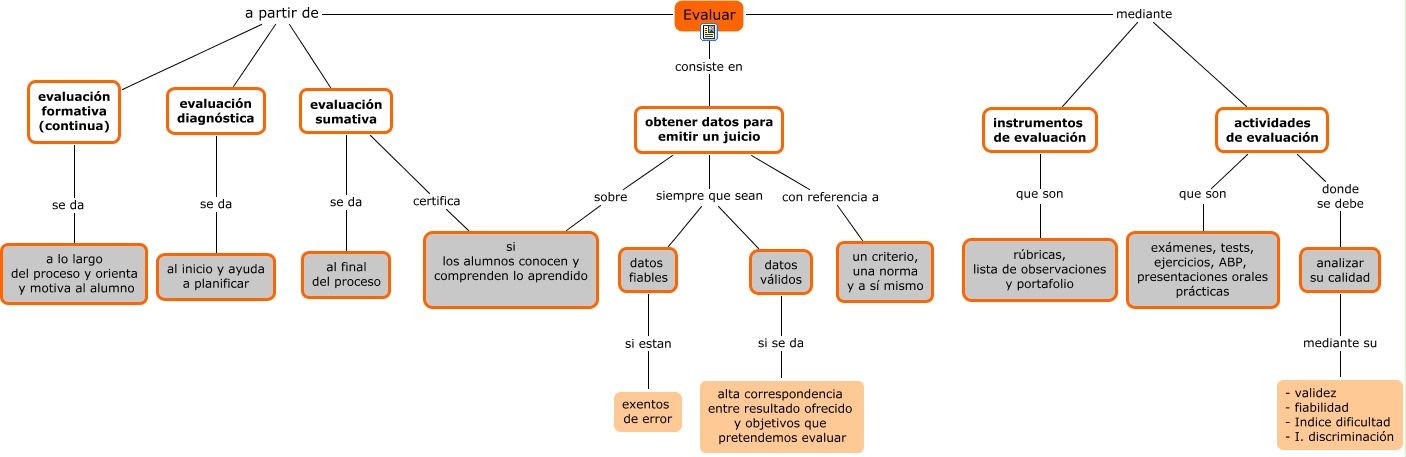 Este Cmap, tiene información relacionada con: EVALUACION, obtener datos para emitir un juicio sobre si los alumnos conocen y comprenden lo aprendido, Evaluar mediante instrumentos de evaluación, evaluación sumativa se da al final del proceso, evaluación formativa (continua) se da a lo largo del proceso y orienta y motiva al alumno, obtener datos para emitir un juicio siempre que sean datos fiables, evaluación diagnóstica se da al inicio y ayuda a planificar, Evaluar a partir de evaluación sumativa, datos válidos si se da alta correspondencia entre resultado ofrecido y objetivos que pretendemos evaluar, Evaluar consiste en obtener datos para emitir un juicio, obtener datos para emitir un juicio siempre que sean datos válidos, instrumentos de evaluación que son rúbricas, lista de observaciones y portafolio, Evaluar a partir de evaluación diagnóstica, evaluación sumativa certifica si los alumnos conocen y comprenden lo aprendido, analizar su calidad mediante su - validez - fiabilidad - Indice dificultad - I. discriminación, Evaluar a partir de evaluación formativa (continua), actividades de evaluación que son exámenes, tests, ejercicios, ABP, presentaciones orales prácticas, actividades de evaluación donde se debe analizar su calidad, obtener datos para emitir un juicio con referencia a un criterio, una norma y a sí mismo, Evaluar mediante actividades de evaluación, datos fiables si estan exentos de error