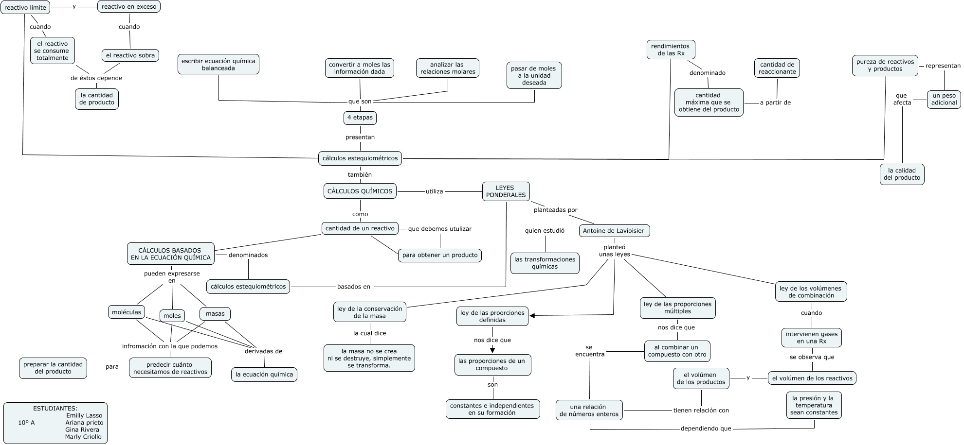 Este Cmap, tiene información relacionada con: CÁLCULOS QUÍMICOS aegm, ley de los volúmenes de combinación cuando intervienen gases en una Rx, 4 etapas que son convertir a moles las información dada, las proporciones de un compuesto son constantes e independientes en su formación, CÁLCULOS BASADOS EN LA ECUACIÓN QUÍMICA pueden expresarse en moles, moles infromación con la que podemos predecir cuánto necesitamos de reactivos, 4 etapas que son pasar de moles a la unidad deseada, LEYES PONDERALES planteadas por Antoine de Lavioisier, rendimientos de las Rx denominado cantidad máxima que se obtiene del producto, predecir cuánto necesitamos de reactivos para preparar la cantidad del producto, ley de las proorciones definidas nos dice que las proporciones de un compuesto, reactivo límite y reactivo en exceso, CÁLCULOS BASADOS EN LA ECUACIÓN QUÍMICA denominados cálculos estequiométricos, ley de la conservación de la masa la cual dice la masa no se crea ni se destruye, simplemente se transforma., CÀLCULOS QUÍMICOS utiliza LEYES PONDERALES, Antoine de Lavioisier planteó unas leyes ley de los volúmenes de combinación, el volúmen de los productos tienen relación con una relación de números enteros, cantidad máxima que se obtiene del producto a partir de cantidad de reaccionante, CÀLCULOS QUÍMICOS como cantidad de un reactivo, masas infromación con la que podemos predecir cuánto necesitamos de reactivos, reactivo en exceso cuando el reactivo sobra
