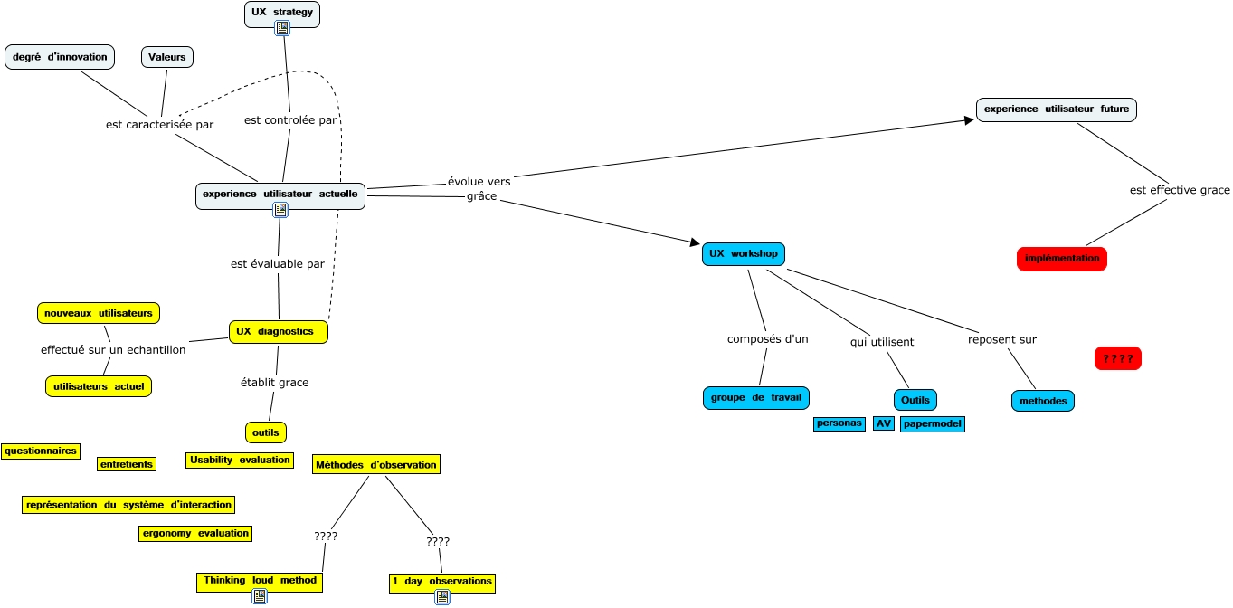Cette carte de concepts créée avec IHMC CmapTools traite de: uxprestation, UX workshop qui utilisent Outils, UX diagnostics effectué sur un echantillon utilisateurs actuel, UX workshop composés d'un groupe de travail, UX workshop reposent sur methodes, Méthodes d'observation ???? Thinking loud method, experience utilisateur future est effective grace implémentation, experience utilisateur actuelle évolue vers experience utilisateur future, experience utilisateur actuelle est évaluable par UX diagnostics, UX diagnostics effectué sur un echantillon nouveaux utilisateurs, Méthodes d'observation ???? 1 day observations, UX diagnostics établit grace outils, experience utilisateur actuelle grâce UX workshop, UX strategy est controlée par experience utilisateur actuelle