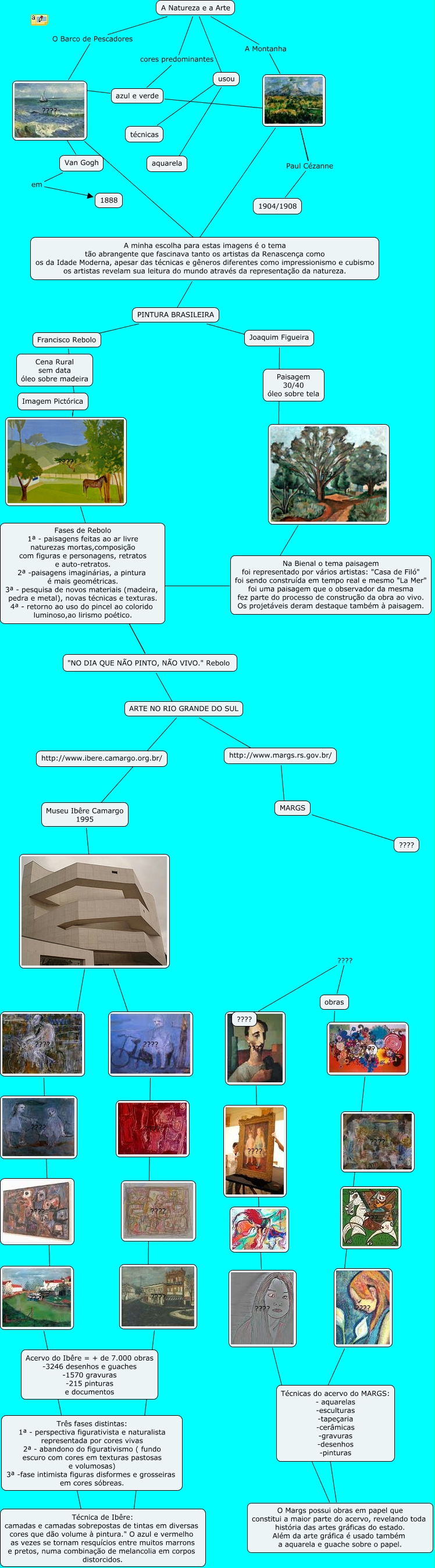 Esse mapa conceitual, produzido no IHMC CmapTools, tem a informação relacionada a: regina, Fases de Rebolo 1ª - paisagens feitas ao ar livre naturezas mortas,composição com figuras e personagens, retratos e auto-retratos. 2ª -paisagens imaginárias, a pintura é mais geométricas. 3ª - pesquisa de novos materiais (madeira, pedra e metal), novas técnicas e texturas. 4ª - retorno ao uso do pincel ao colorido luminoso,ao lirismo poético. ???? "NO DIA QUE NÃO PINTO, NÃO VIVO." Rebolo, Van Gogh em 1888, ???? ???? A minha escolha para estas imagens é o tema tão abrangente que fascinava tanto os artistas da Renascença como os da Idade Moderna, apesar das técnicas e gêneros diferentes como impressionismo e cubismo os artistas revelam sua leitura do mundo através da representação da natureza., usou ???? aquarela, azul e verde ???? ????, Na Bienal o tema paisagem foi representado por vários artistas: "Casa de Filó" foi sendo construída em tempo real e mesmo "La Mer" foi uma paisagem que o observador da mesma fez parte do processo de construção da obra ao vivo. Os projetáveis deram destaque também à paisagem. ???? Fases de Rebolo 1ª - paisagens feitas ao ar livre naturezas mortas,composição com figuras e personagens, retratos e auto-retratos. 2ª -paisagens imaginárias, a pintura é mais geométricas. 3ª - pesquisa de novos materiais (madeira, pedra e metal), novas técnicas e texturas. 4ª - retorno ao uso do pincel ao colorido luminoso,ao lirismo poético., obras ???? ????, A minha escolha para estas imagens é o tema tão abrangente que fascinava tanto os artistas da Renascença como os da Idade Moderna, apesar das técnicas e gêneros diferentes como impressionismo e cubismo os artistas revelam sua leitura do mundo através da representação da natureza. ???? PINTURA BRASILEIRA, http://www.margs.rs.gov.br/ ???? MARGS, ???? ????, ???? ???? O Margs possui obras em papel que constitui a maior parte do acervo, revelando toda história das artes gráficas do estado. Além da arte gráfica é usado também a aquarela e guache sobre o papel., Fases de Rebolo 1ª - paisagens feitas ao ar livre naturezas mortas,composição com figuras e personagens, retratos e auto-retratos. 2ª -paisagens imaginárias, a pintura é mais geométricas. 3ª - pesquisa de novos materiais (madeira, pedra e metal), novas técnicas e texturas. 4ª - retorno ao uso do pincel ao colorido luminoso,ao lirismo poético. ???? "NO DIA QUE NÃO PINTO, NÃO VIVO." Rebolo, PINTURA BRASILEIRA ???? Francisco Rebolo, ???? ???? O Margs possui obras em papel que constitui a maior parte do acervo, revelando toda história das artes gráficas do estado. Além da arte gráfica é usado também a aquarela e guache sobre o papel., ???? ???? A minha escolha para estas imagens é o tema tão abrangente que fascinava tanto os artistas da Renascença como os da Idade Moderna, apesar das técnicas e gêneros diferentes como impressionismo e cubismo os artistas revelam sua leitura do mundo através da representação da natureza., "NO DIA QUE NÃO PINTO, NÃO VIVO." Rebolo ???? ARTE NO RIO GRANDE DO SUL, A Natureza e a Arte A Montanha ????, ???? ???? Na Bienal o tema paisagem foi representado por vários artistas: "Casa de Filó" foi sendo construída em tempo real e mesmo "La Mer" foi uma paisagem que o observador da mesma fez parte do processo de construção da obra ao vivo. Os projetáveis deram destaque também à paisagem., ???? ???? ????, obras ???? ????