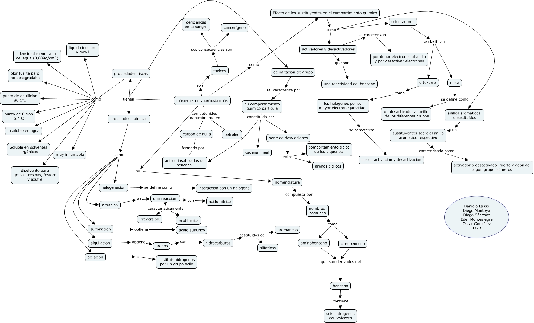 Este Cmap, tiene información relacionada con: COMPUESTOS AROMÁTICOS, Diego S, Daniela, Diego M, Eder, Oscar, una reaccion con ácido nítrico, activadores y desactivadores que son una reactividad del benceno, benceno contiene seis hidrogenos equivalentes, serie de desviaciones entre comportamiento tipico de los alquenos, propidades quimicas como sulfonacion, propidades quimicas como halogenacion, alquilacion obtiene arenos, COMPUESTOS AROMÁTICOS como Efecto de los sustituyentes en el compartimiento quimico, Efecto de los sustituyentes en el compartimiento quimico como activadores y desactivadores, clorobenceno que son derivados del benceno, propiedades físcas como liquido incoloro y movil, los halogenos por su mayor electronegatividad se caracteriza por su activacion y desactivacion, una reaccion caracterízticamente irreversible, su comportamiento quimico particular constituido por anillos insaturados de benceno, Efecto de los sustituyentes en el compartimiento quimico como anillos aromaticos disustituidos, COMPUESTOS AROMÁTICOS tienen propiedades físcas, propiedades físcas como punto de ebullición 80,1°C, propiedades físcas como olor fuerte pero no desagradable, anillos aromaticos disustituidos son sustituyentes sobre el anillo aromatico respectivo, Efecto de los sustituyentes en el compartimiento quimico como orientadores