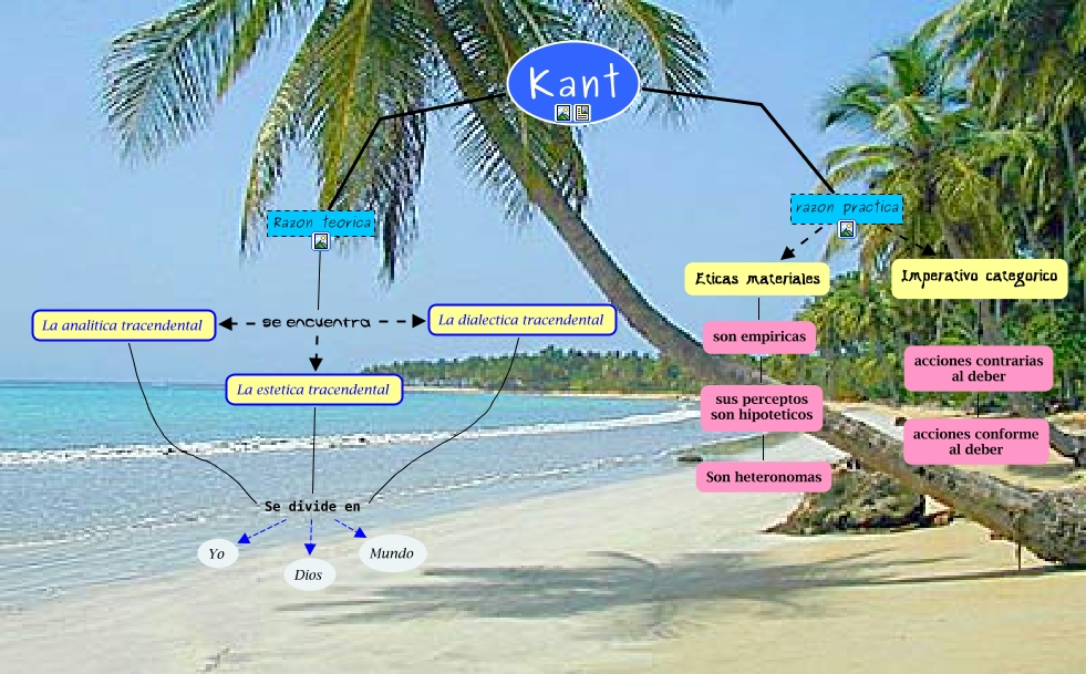 Este Cmap, tiene información relacionada con: kant, Se divide en Mundo, razon practica Eticas materiales, La estetica tracendental Se divide en, Se divide en Yo, Se divide en Dios, La analitica tracendental Se divide en, acciones contrarias al deber acciones conforme al deber, Kant Razon teorica, son empiricas sus perceptos son hipoteticos, razon practica Imperativo categorico, Imperativo categorico acciones contrarias al deber, Razon teorica se encuentra La estetica tracendental, Kant razon practica, La dialectica tracendental Se divide en, Razon teorica se encuentra La analitica tracendental, Eticas materiales son empiricas, sus perceptos son hipoteticos Son heteronomas, Razon teorica se encuentra La dialectica tracendental