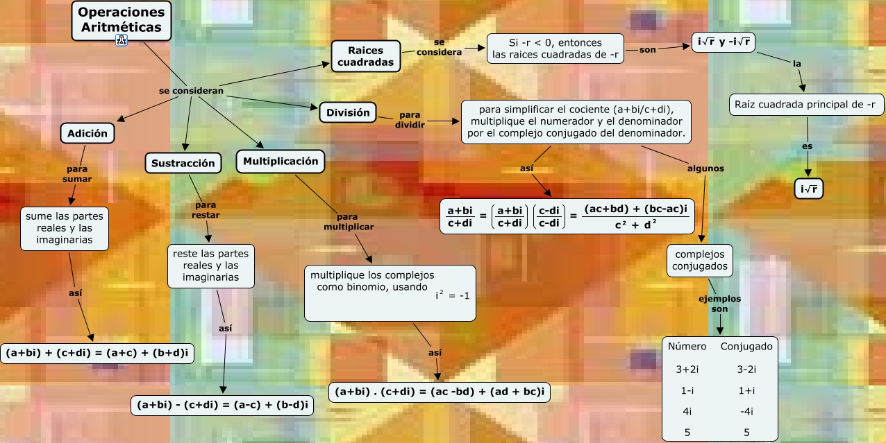 Este Cmap, tiene información relacionada con: ComplejosOperAritmeticas, para simplificar el cociente (a+bi/c+di), multiplique el numerador y el denominador por el complejo conjugado del denominador. algunos complejos conjugados, Raices cuadradas se considera Si -r < 0, entonces las raices cuadradas de -r, para simplificar el cociente (a+bi/c+di), multiplique el numerador y el denominador por el complejo conjugado del denominador. así <math xmlns="http://www.w3.org/1998/Math/MathML"> <mrow> <mfrac> <mtext> a+bi </mtext> <mtext> c+di </mtext> </mfrac> <mtext> = </mtext> <mfenced open="(" close=")"> <mfrac> <mtext> a+bi </mtext> <mtext> c+di </mtext> </mfrac> </mfenced> <mtext> </mtext> <mfenced open="(" close=")"> <mfrac> <mtext> c-di </mtext> <mtext> c-di </mtext> </mfrac> </mfenced> <mtext> = </mtext> <mfrac> <mtext> (ac+bd) + (bc-ac)i </mtext> <mrow> <mmultiscripts> <mtext> c </mtext> <none/> <mtext> 2 </mtext> </mmultiscripts> <mtext> + </mtext> <mmultiscripts> <mtext> d </mtext> <none/> <mtext> 2 </mtext> </mmultiscripts> </mrow> </mfrac> </mrow> </math>, Si -r < 0, entonces las raices cuadradas de -r son <math xmlns="http://www.w3.org/1998/Math/MathML"> <mrow> <mtext> i </mtext> <msqrt> <mtext> r </mtext> </msqrt> <mtext> y -i </mtext> <msqrt> <mtext> r </mtext> </msqrt> </mrow> </math>, <math xmlns="http://www.w3.org/1998/Math/MathML"> <mrow> <mtext> i </mtext> <msqrt> <mtext> r </mtext> </msqrt> <mtext> y -i </mtext> <msqrt> <mtext> r </mtext> </msqrt> </mrow> </math> la <math xmlns="http://www.w3.org/1998/Math/MathML"> <mrow> <mtext> Raíz cuadrada principal de -r </mtext> </mrow> </math>, Adición para sumar sume las partes reales y las imaginarias, reste las partes reales y las imaginarias así (a+bi) - (c+di) = (a-c) + (b-d)i, complejos conjugados ejemplos son <math xmlns="http://www.w3.org/1998/Math/MathML"> <mrow> <mtable> <mtr> <mtd> <mtext> Número </mtext> </mtd> <mtd> <mtext> Conjugado </mtext> </mtd> </mtr> <mtr> <mtd> <mtext> 3+2i </mtext> </mtd> <mtd> <mtext> 3-2i </mtext> </mtd> </mtr> <mtr> <mtd> <mtext> 1-i </mtext> </mtd> <mtd> <mtext> 1+i </mtext> </mtd> </mtr> <mtr> <mtd> <mtext> 4i </mtext> </mtd> <mtd> <mtext> -4i </mtext> </mtd> </mtr> <mtr> <mtd> <mtext> 5 </mtext> </mtd> <mtd> <mtext> 5 </mtext> </mtd> </mtr> </mtable> </mrow> </math>, Operaciones Aritméticas se consideran Adición, Operaciones Aritméticas se consideran División, <math xmlns="http://www.w3.org/1998/Math/MathML"> <mrow> <mtext> multiplique los complejos