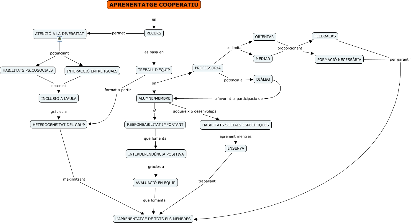 Este Cmap, tiene información relacionada con: APRENENTATGE COOPERATIU, ATENCIÓ A LA DIVERSITAT potenciant INTERACCIÓ ENTRE IGUALS, ALUMNE/MEMBRE té RESPONSABILITAT IMPORTANT, HABILITATS PSICOSOCIALS obtenint INCLUSIÓ A L'AULA, PROFESSOR/A es limita MEDIAR, MEDIAR proporcionant FORMACIÓ NECESSÀRIA, DIÀLEG afavorint la participació de ALUMNE/MEMBRE, AVALUACIÓ EN EQUIP que fomenta L'APRENENTATGE DE TOTS ELS MEMBRES, PROFESSOR/A potencia el DIÀLEG, ORIENTAR proporcionant FEEDBACKS, INTERACCIÓ ENTRE IGUALS obtenint INCLUSIÓ A L'AULA, MEDIAR proporcionant FEEDBACKS, TREBALL D'EQUIP on PROFESSOR/A, RECURS permet ATENCIÓ A LA DIVERSITAT, ORIENTAR proporcionant FORMACIÓ NECESSÀRIA, INCLUSIÓ A L'AULA gràcies a HETEROGENEÏTAT DEL GRUP, RESPONSABILITAT IMPORTANT que fomenta INTERDEPENDÈNCIA POSITIVA, TREBALL D'EQUIP format a partir HETEROGENEÏTAT DEL GRUP, ENSENYA treballant L'APRENENTATGE DE TOTS ELS MEMBRES, TREBALL D'EQUIP on ALUMNE/MEMBRE, PROFESSOR/A es limita ORIENTAR