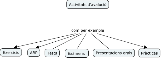Este Cmap, tiene información relacionada con: Activitats d'avaluació, Activitats d'avalució com per exemple Exàmens, Activitats d'avalució com per exemple Pràcticas, Activitats d'avalució com per exemple Tests, Activitats d'avalució com per exemple Exercicis, Activitats d'avalució com per exemple ABP, Activitats d'avalució com per exemple Presentacions orals