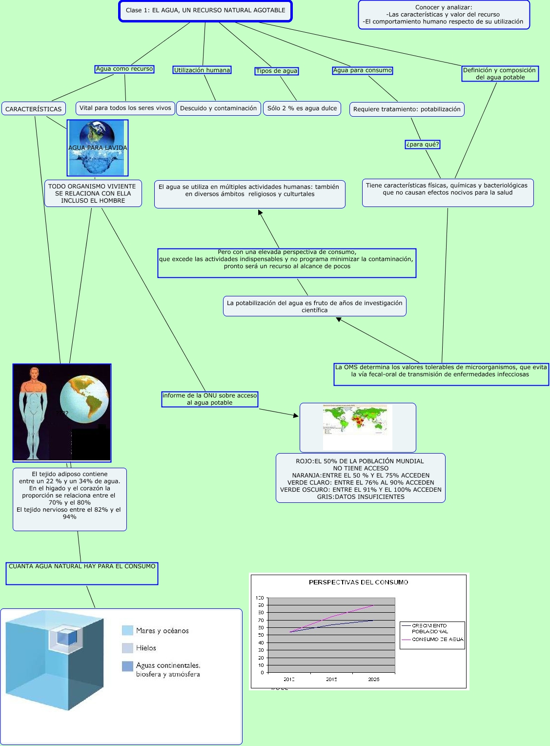 Este Cmap, tiene información relacionada con: Clase 1 EL AGUA, UN RECURSO NATURAL AGOTABLE, Clase 1: EL AGUA, UN RECURSO NATURAL AGOTABLE Agua como recurso CARACTERÍSTICAS, Clase 1: EL AGUA, UN RECURSO NATURAL AGOTABLE Agua para consumo Requiere tratamiento: potabilización, Requiere tratamiento: potabilización ¿para qué? Tiene características físicas, químicas y bacteriológicas que no causan efectos nocivos para la salud, TODO ORGANISMO VIVIENTE SE RELACIONA CON ELLA INCLUSO EL HOMBRE informe de la ONU sobre acceso al agua potable, La potabilización del agua es fruto de años de investigación científica Pero con una elevada perspectiva de consumo, que excede las actividades indispensables y no programa minimizar la contaminación, pronto será un recurso al alcance de pocos El agua se utiliza en múltiples actividades humanas: también en diversos ámbitos religiosos y culturtales, Clase 1: EL AGUA, UN RECURSO NATURAL AGOTABLE Definición y composición del agua potable Tiene características físicas, químicas y bacteriológicas que no causan efectos nocivos para la salud, Clase 1: EL AGUA, UN RECURSO NATURAL AGOTABLE Agua como recurso Vital para todos los seres vivos, Tiene características físicas, químicas y bacteriológicas que no causan efectos nocivos para la salud La OMS determina los valores tolerables de microorganismos, que evita la vía fecal-oral de transmisión de enfermedades infecciosas La potabilización del agua es fruto de años de investigación científica, CARACTERÍSTICAS AGUA PARA LAVIDA TODO ORGANISMO VIVIENTE SE RELACIONA CON ELLA INCLUSO EL HOMBRE, Clase 1: EL AGUA, UN RECURSO NATURAL AGOTABLE Tipos de agua Sólo 2 % es agua dulce, CARACTERÍSTICAS CUANTA AGUA NATURAL HAY PARA EL CONSUMO, Clase 1: EL AGUA, UN RECURSO NATURAL AGOTABLE Utilización humana Descuido y contaminación, TODO ORGANISMO VIVIENTE SE RELACIONA CON ELLA INCLUSO EL HOMBRE ???? El tejido adiposo contiene entre un 22 % y un 34% de agua. En el higado y el corazón la proporción se relaciona entre el 70% y el 80% El tejido nervioso entre el 82% y el 94%
