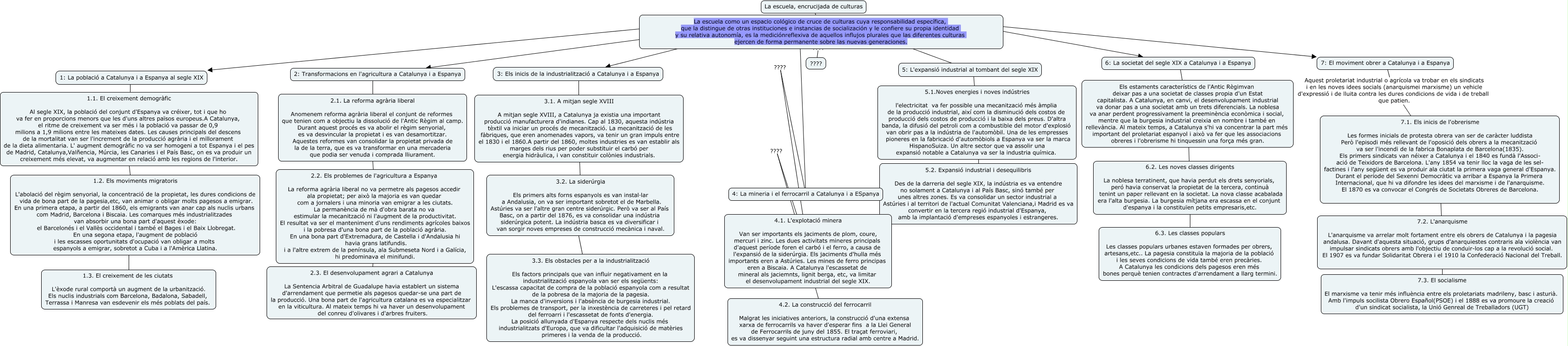 Este Cmap, tiene información relacionada con: tema 7, 5: L'expansió industrial al tombant del segle XIX ???? 5.1.Noves energies i noves indústries l'electricitat va fer possible una mecanització més àmplia de la producció industrial, així com la disminució dels costos de producció dels costos de producció i la baixa dels preus. D'altra banda, la difusió del petroli com a combustible del motor d'explosió van obrir pas a la indústria de l'automòbil. Una de les empresses pioneres en la fabricació d'automòbiols a Espanya va ser la marca HispanoSuiza. Un altre sector que va assolir una expansió notable a Catalunya va ser la industria química., La escuela como un espacio cológico de cruce de culturas cuya responsabilidad específica, que la distingue de otras instituciones e instancias de socialización y le confiere su propia identidad y su relativa autonomía, es la mediciónreflexiva de aquellos influjos plurales que las diferentes culturas ejercen de forma permanente sobre las nuevas generaciones. ???? 7: El moviment obrer a Catalunya i a Espanya, 1.1. El creixement demogràfic Al segle XIX, la població del conjunt d'Espanya va créixer, tot i que ho va fer en proporcions menors que les d'uns altres països europeus.A Catalunya, el ritme de creixement va ser més i la població va passar de 0,9 milions a 1,9 milions entre les mateixes dates. Les causes principals del descens de la mortalitat van ser l'increment de la producció agrària i el millorament de la dieta alimentaria. L' augment demogràfic no va ser homogeni a tot Espanya i el pes de Madrid, Catalunya,Valñencia, Múrcia, les Canaries i el País Basc, on es va produir un creixement més elevat, va augmentar en relació amb les regions de l'interior. ???? 1.2. Els moviments migratoris L'abolació del règim senyorial, la concentració de la propietat, les dures condicions de vida de bona part de la pagesia,etc, van animar o obligar molts pagesos a emigrar. En una primera etapa, a partir del 1860, els emigrants van anar cap als nuclis urbans com Madrid, Barcelona i Biscaia. Les comarques més industrialitzades van absorbir una bona part d'aquest èxode: el Barcelonés i el Vallès occidental i també el Bages i el Baix Llobregat. En una segona etapa, l'augment de població i les escasses oportunitats d'ocupació van obligar a molts espanyols a emigrar, sobretot a Cuba i a l'Amèrica Llatina., 5.1.Noves energies i noves indústries l'electricitat va fer possible una mecanització més àmplia de la producció industrial, així com la disminució dels costos de producció dels costos de producció i la baixa dels preus. D'altra banda, la difusió del petroli com a combustible del motor d'explosió van obrir pas a la indústria de l'automòbil. Una de les empresses pioneres en la fabricació d'automòbiols a Espanya va ser la marca HispanoSuiza. Un altre sector que va assolir una expansió notable a Catalunya va ser la industria química. ???? 5.2. Expansió industrial i desequilibris Des de la darreria del segle XIX, la indústria es va entendre no solament a Catalunya i al País Basc, sinó també per unes altres zones. Es va consolidar un sector industrial a Astúries i al territori de l'actual Comunitat Valenciana,i Madrid es va convertir en la tercera regió industrial d'Espanya, amb la implantació d'empreses espanyoles i estrangeres., 7: El moviment obrer a Catalunya i a Espanya Aquest proletariat industrial o agrícola va trobar en els sindicats i en les noves idees socials (anarquismei marxisme) un vehicle d'expressió i de lluita contra les dures condicions de vida i de treball que patien. 7.1. Els inicis de l'obrerisme Les formes inicials de protesta obrera van ser de caràcter luddista Però l'episodi més rellevant de l'oposició dels obrers a la mecanització va ser l'incendi de la fabrica Bonaplata de Barcelona(1835). Els primers sindicats van néixer a Catalunya i el 1840 es fundà l'Associ- ació de Teixidors de Barcelona. L'any 1854 va tenir lloc la vaga de les sel- factines i l'any següent es va produir ala ciutat la primera vaga general d'Espanya. Durant el període del Sexenni Democràtic va arribar a Espanya la Primera Internacional, que hi va difondre les idees del marxisme i de l'anarquisme. El 1870 es va convocar el Congrés de Societats Obreres de Barcelona., 6.2. Les noves classes dirigents La noblesa terratinent, que havia perdut els drets senyorials, peró havia conservat la propietat de la tercera, continuà tenint un paper rellevant en la societat. La nova classe acabalada era l'alta burgesia. La burgesia mítjana era escassa en el conjunt d'espanya i la constituïen petits empresaris,etc. ???? 6.3. Les classes populars Les classes populars urbanes estaven formades per obrers, artesans,etc.. La pagesia constituïa la majoria de la població i les seves condicions de vida també eren precàries. A Catalunya les condicions dels pagesos eren més bones perquè tenien contractes d'arrendament a llarg termini., 7.1. Els inicis de l'obrerisme Les formes inicials de protesta obrera van ser de caràcter luddista Però l'episodi més rellevant de l'oposició dels obrers a la mecanització va ser l'incendi de la fabrica Bonaplata de Barcelona(1835). Els primers sindicats van néixer a Catalunya i el 1840 es fundà l'Associ- ació de Teixidors de Barcelona. L'any 1854 va tenir lloc la vaga de les sel- factines i l'any següent es va produir ala ciutat la primera vaga general d'Espanya. Durant el període del Sexenni Democràtic va arribar a Espanya la Primera Internacional, que hi va difondre les idees del marxisme i de l'anarquisme. El 1870 es va convocar el Congrés de Societats Obreres de Barcelona. ???? 7.2. L'anarquisme L'anarquisme va arrelar molt fortament entre els obrers de Catalunya i la pagesia andalusa. Davant d'aquesta situació, grups d'anarquiestes contraris ala violència van impulsar sindicats obrers amb l'objectiu de conduir-los cap a la revolució social. El 1907 es va fund