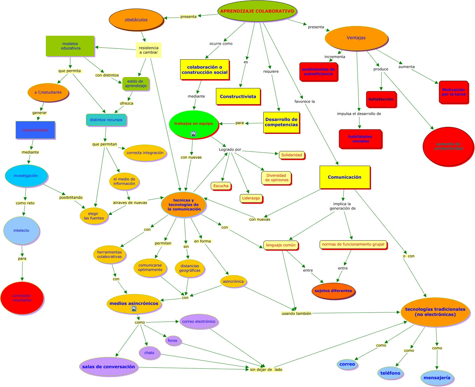 Este Cmap, tiene información relacionada con: Aprendizaje Colaborativo, investigación como reto intelecto, trabajos en equipo Logrado por Liderazgo, tecnologías tradicionales (no electrónicas) como correo, Comunicación o con tecnologías tradicionales (no electrónicas), trabajos en equipo Logrado por Escucha, Ventajas produce Satisfacción, trabajos en equipo Logrado por Diversidad de opiniones, obstáculos resistencia a cambiar tecnicas y tecnologías de la comunicación, normas de funcionamiento grupal entre sujetos diferentes, Comunicación implica la generación de normas de funcionamiento grupal, el medio de información atraves de nuevas tecnicas y tecnologías de la comunicación, tecnicas y tecnologías de la comunicación permiten comunicarse optimamente, asincrónica con medios asincrónicos, Ventajas produce aumento de productividad, asincrónica usando también tecnologías tradicionales (no electrónicas), Ventajas incrementa sentimientos de autoeficiencia, tecnicas y tecnologías de la comunicación con herramientas colaborativas, medios asincrónicos como chats, Ventajas impulsa el desarrollo de habilidades sociales, tecnologías tradicionales (no electrónicas) como teléfono