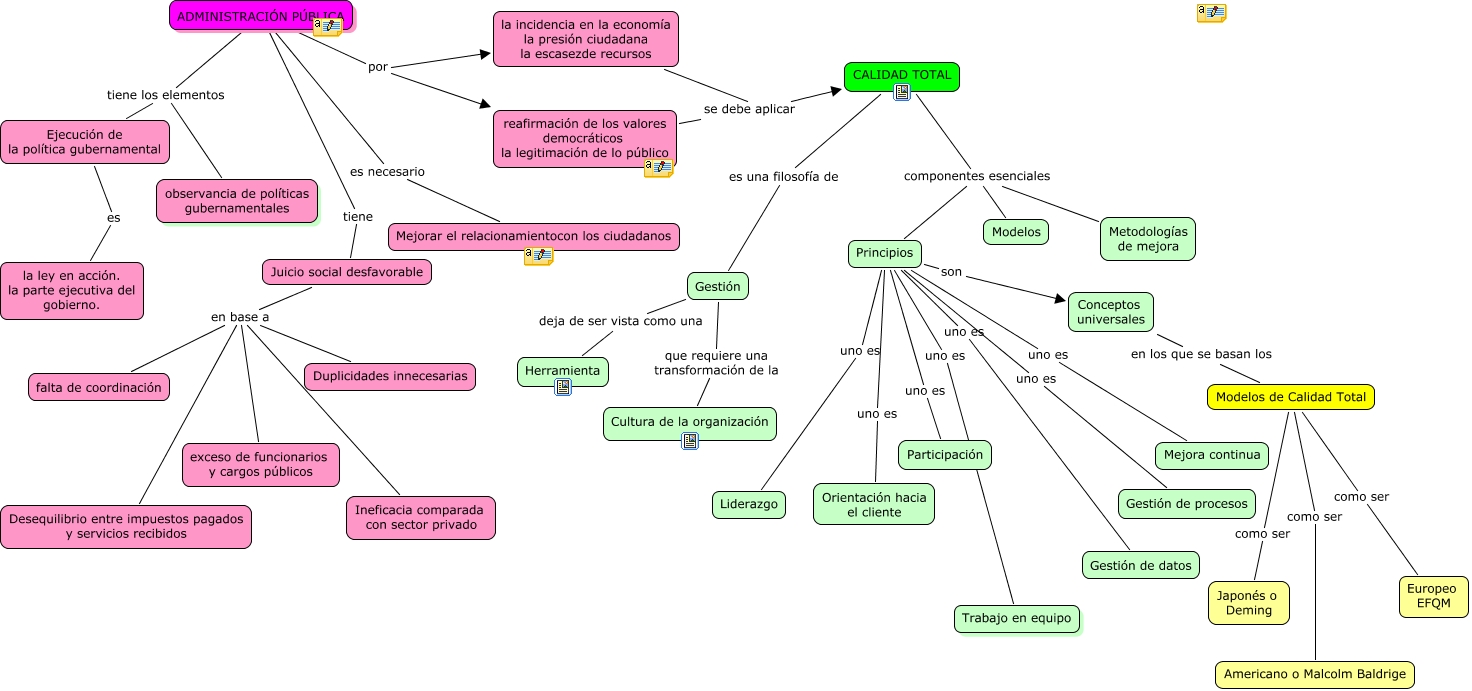 Este Cmap, tiene información relacionada con: Calidad Total y Administración Pública, Juicio social desfavorable en base a Ineficacia comparada con sector privado, Conceptos universales en los que se basan los Modelos de Calidad Total, Modelos de Calidad Total como ser Americano o Malcolm Baldrige, Juicio social desfavorable en base a Desequilibrio entre impuestos pagados y servicios recibidos, Juicio social desfavorable en base a falta de coordinación, Principios uno es Gestión de datos, Gestión deja de ser vista como una Herramienta, Modelos de Calidad Total como ser Europeo EFQM, CALIDAD TOTAL componentes esenciales Principios, Juicio social desfavorable en base a exceso de funcionarios y cargos públicos, ADMINISTRACIÓN PÚBLICA tiene los elementos observancia de políticas gubernamentales, ADMINISTRACIÓN PÚBLICA por la incidencia en la economía la presión ciudadana la escasezde recursos, Principios uno es Liderazgo, Principios uno es Gestión de procesos, Gestión que requiere una transformación de la Cultura de la organización, Modelos de Calidad Total como ser Japonés o Deming, Principios uno es Orientación hacia el cliente, ADMINISTRACIÓN PÚBLICA tiene los elementos Ejecución de la política gubernamental, ADMINISTRACIÓN PÚBLICA por reafirmación de los valores democráticos la legitimación de lo público, ADMINISTRACIÓN PÚBLICA tiene Juicio social desfavorable