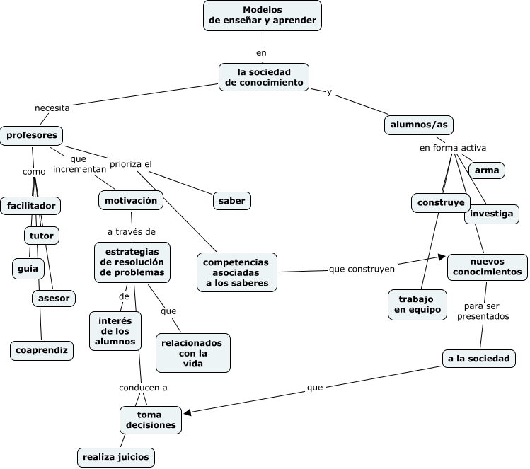 Este Cmap, tiene información relacionada con: MODELOS DE ENSEÑAR Y APRENDER, estrategias de resolución de problemas conducen a realiza juicios, alumnos/as en forma activa nuevos conocimientos, a la sociedad que toma decisiones, alumnos/as en forma activa investiga, alumnos/as en forma activa arma, profesores como guía, la sociedad de conocimiento necesita profesores, profesores prioriza el saber, profesores prioriza el competencias asociadas a los saberes, estrategias de resolución de problemas conducen a toma decisiones, profesores como asesor, alumnos/as en forma activa construye, motivación a través de estrategias de resolución de problemas, estrategias de resolución de problemas de interés de los alumnos, profesores como coaprendiz, estrategias de resolución de problemas que relacionados con la vida, la sociedad de conocimiento y alumnos/as, profesores como tutor, nuevos conocimientos para ser presentados a la sociedad, profesores que incrementan motivación
