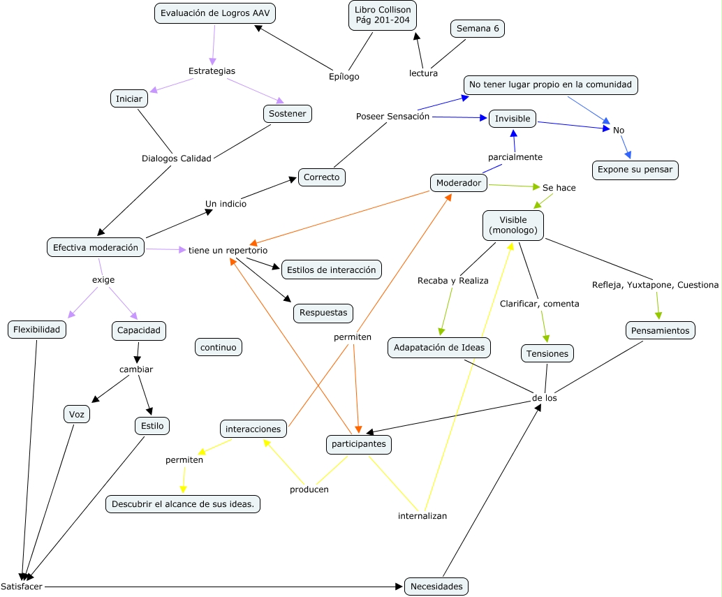 Este Cmap, tiene información relacionada con: Lectura Semana 6 - Autoevaluación Logros, Correcto Poseer Sensación Invisible, Visible (monologo) Recaba y Realiza Adapatación de Ideas, Evaluación de Logros AAV Estrategias Iniciar, Iniciar Dialogos Calidad Efectiva moderación, Efectiva moderación tiene un repertorio Estilos de interacción, Invisible No Expone su pensar, Moderador Se hace Visible (monologo), Pensamientos de los participantes, Correcto Poseer Sensación No tener lugar propio en la comunidad, Moderador tiene un repertorio Respuestas, Moderador parcialmente Invisible, interacciones permiten Descubrir el alcance de sus ideas., No tener lugar propio en la comunidad No Expone su pensar, participantes internalizan Visible (monologo), Adapatación de Ideas de los Tensiones, Adapatación de Ideas de los participantes, Sostener Dialogos Calidad Efectiva moderación, participantes tiene un repertorio Estilos de interacción, participantes tiene un repertorio Respuestas, Evaluación de Logros AAV Estrategias Sostener