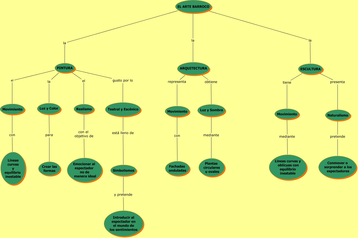 Este Cmap, tiene información relacionada con: Alejandro Ruiz Fernández de Angulo 2º E.S.O. B Tema 11- El siglo del Barroco (El arte Barroco), Simbolismos y pretende Introducir al espectador en el mundo de los sentimientos, ESCULTURA presenta Naturalismo, Movimiento con Fachadas onduladas, PINTURA el Realismo, PINTURA gusto por lo Teatral y Escénico, Luz y Sombra mediante Plantas circulares u ovales, Realismo con el objetivo de Emocionar al espectador no de manera ideal, EL ARTE BARROCO la PINTURA, ARQUITECTURA obtiene Luz y Sombra, EL ARTE BARROCO la ESCULTURA, Movimiento con Líneas curvas y equilibrio inestable, Movimiento mediante Lineas curvas y oblícuas con equilibrio inestable, Luz y Color para Crear las formas, Naturalismo pretende Conmover o sorprender a los espectadores, ARQUITECTURA representa Movimiento, Teatral y Escénico está lleno de Simbolismos, ESCULTURA tiene Movimiento, PINTURA el Movimiento, EL ARTE BARROCO la ARQUITECTURA, PINTURA la Luz y Color